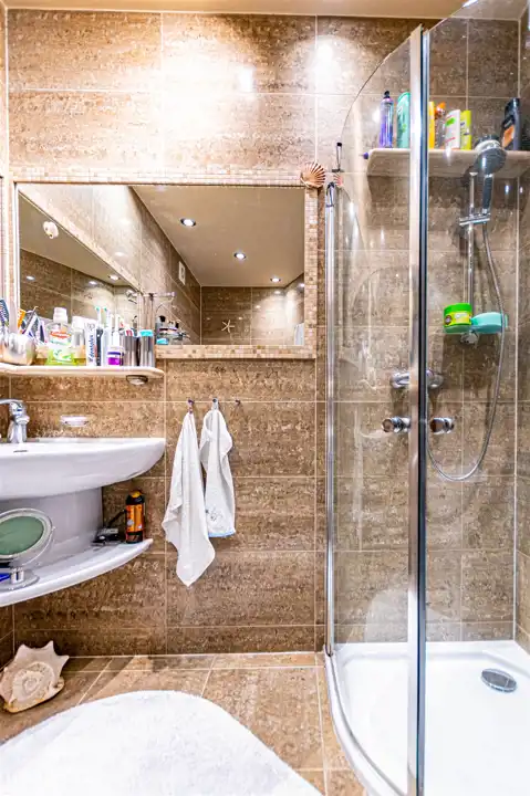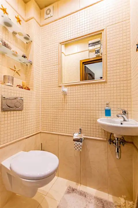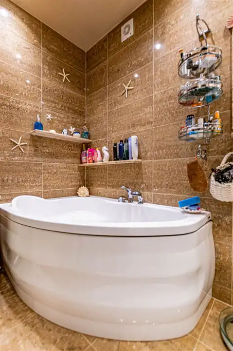- Łazienka o pow. 5,30 m2 z narożną wanną, kabiną prysznicową i umywalką