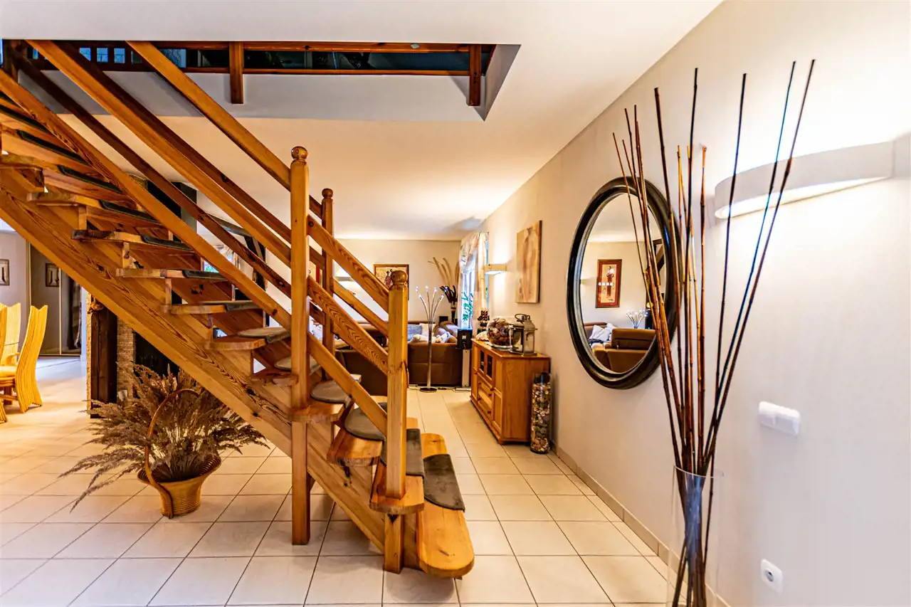 Dom ocieplany wełną mineralną. Na piętro prowadzą drewniane schody.