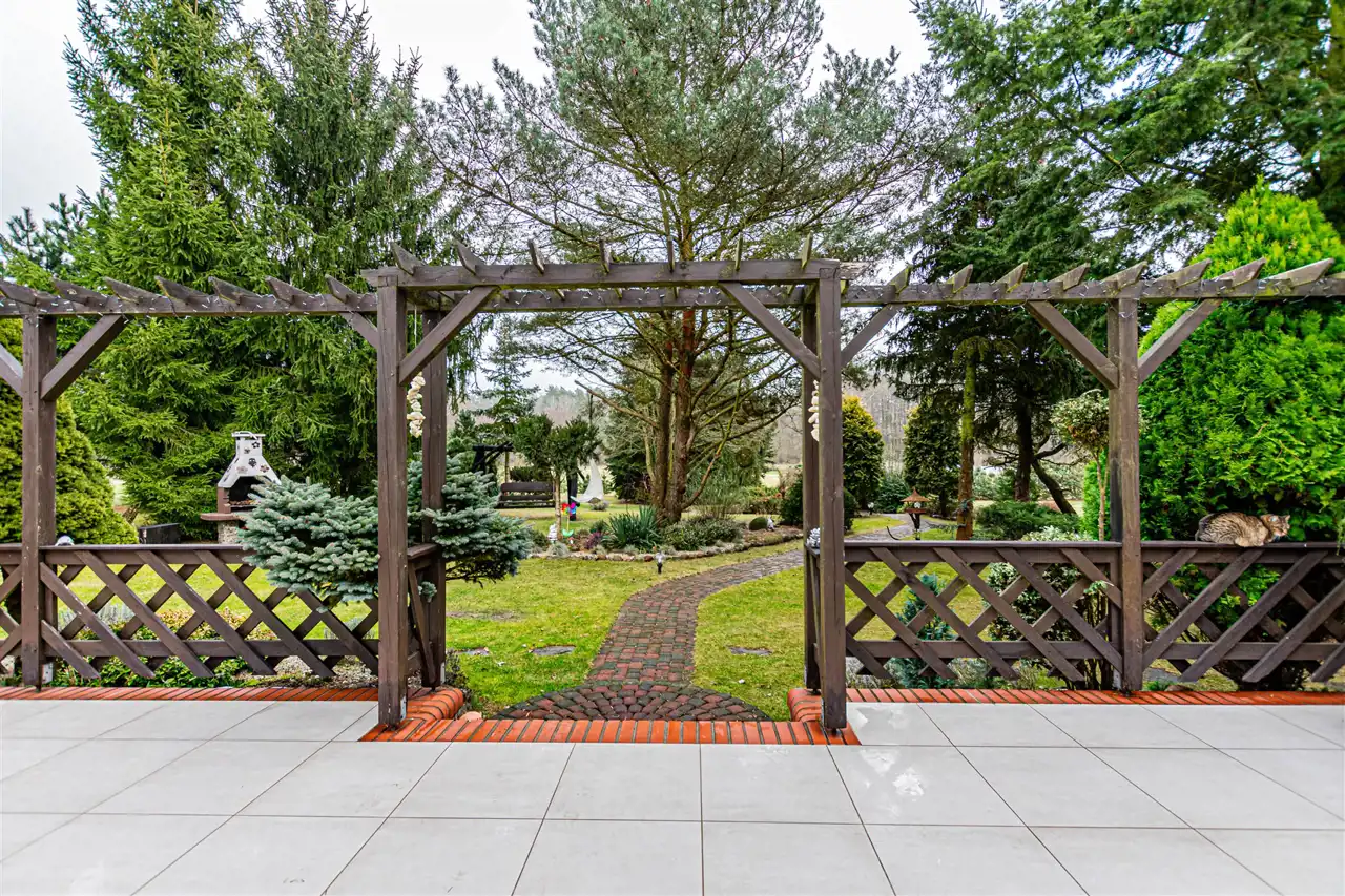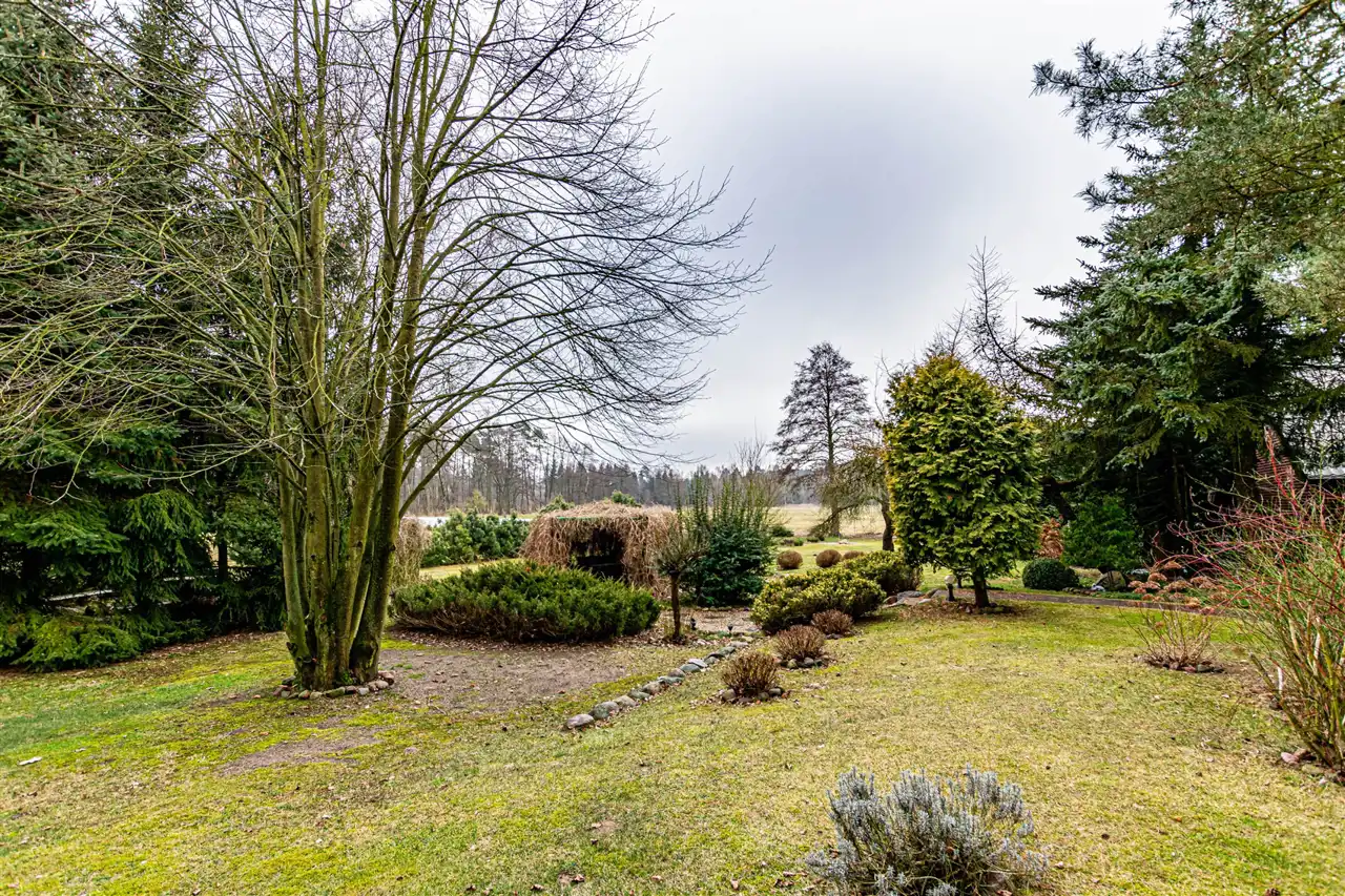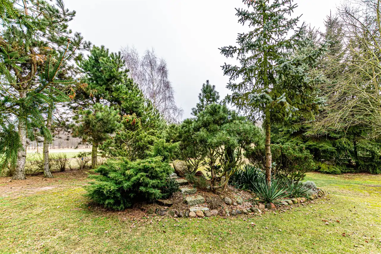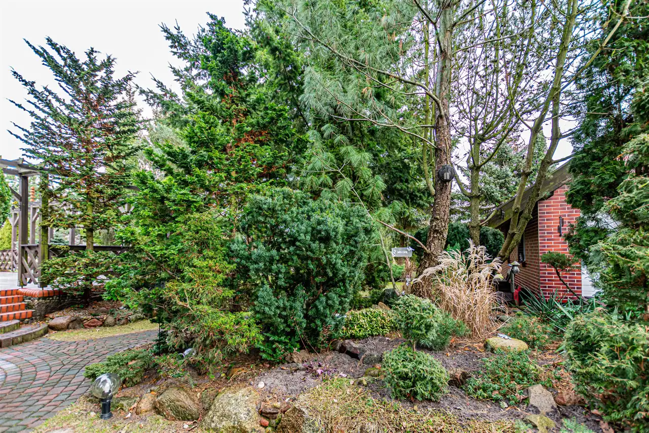 Działka w pełni zagospodarowana z perfekcyjnie zaprojektowanym ogrodem z licznymi drzewami i ozdobnymi krzewami.