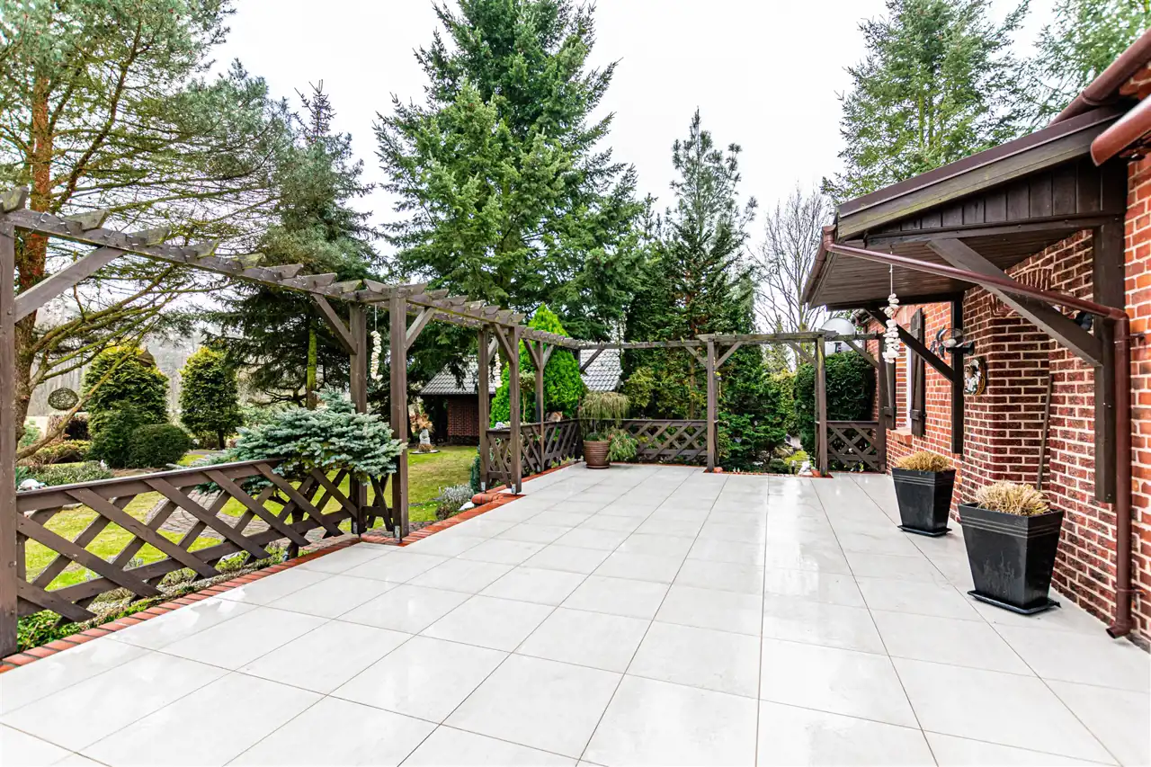 Od tylnej strony budynku znajduje się taras utwardzony płatkami ceramicznymi, taras posiada otwieraną markizę.