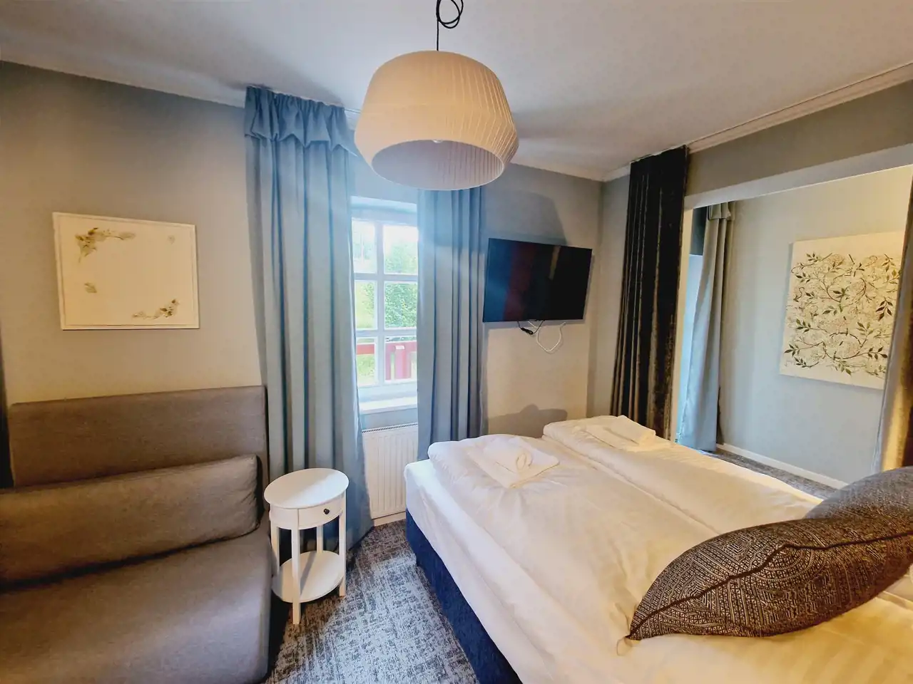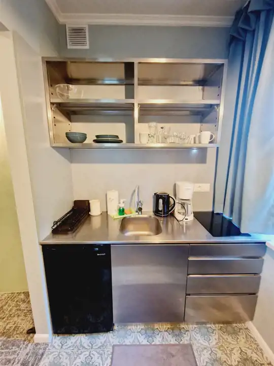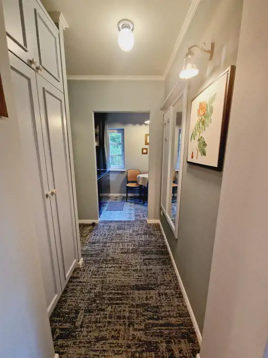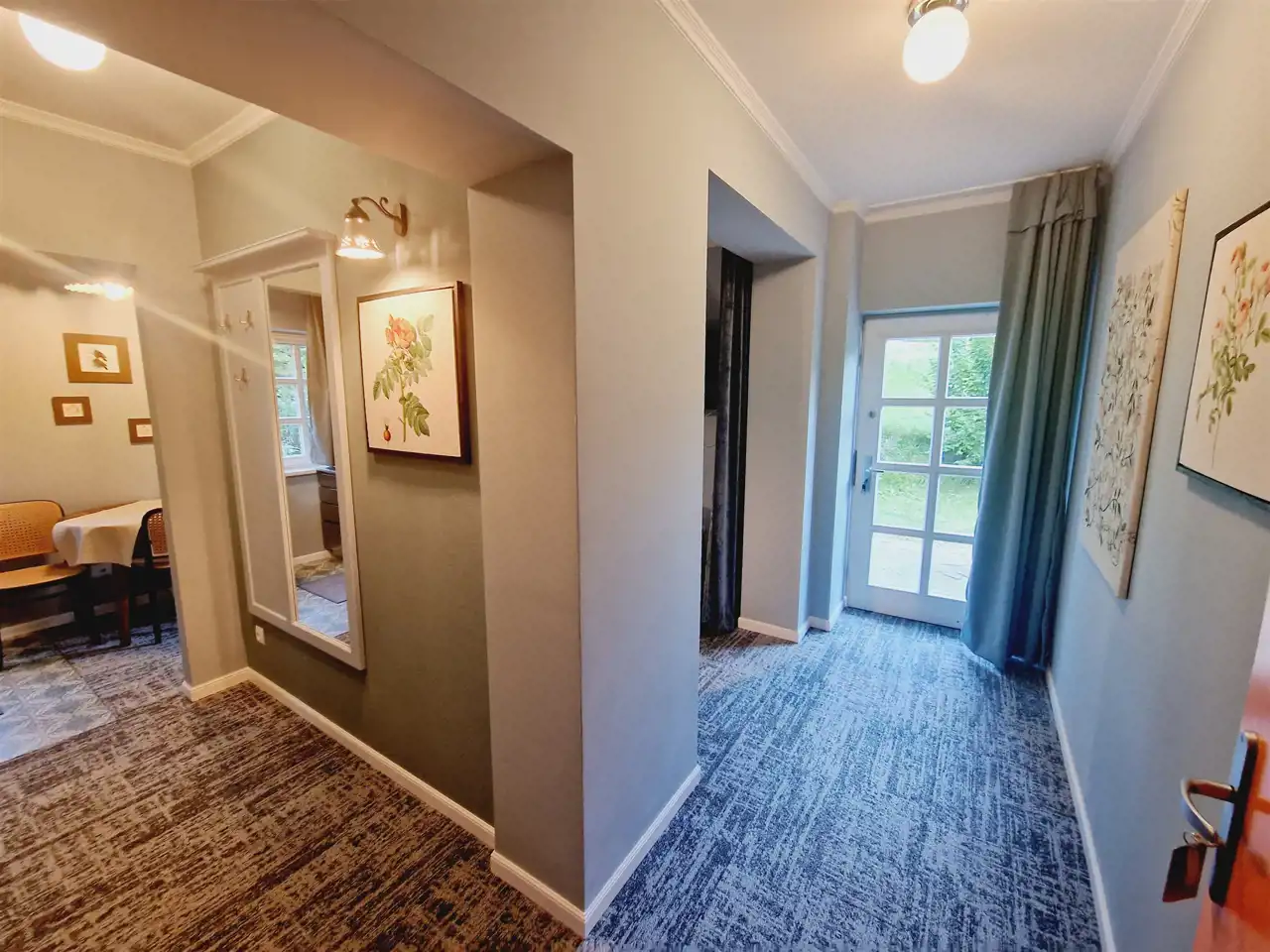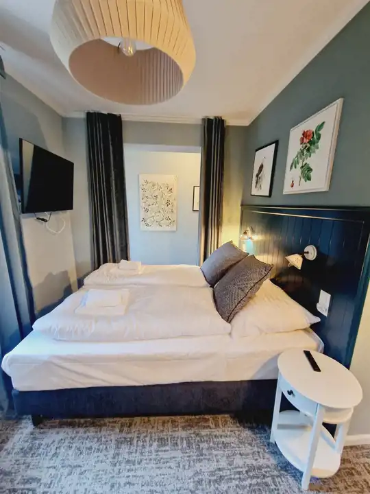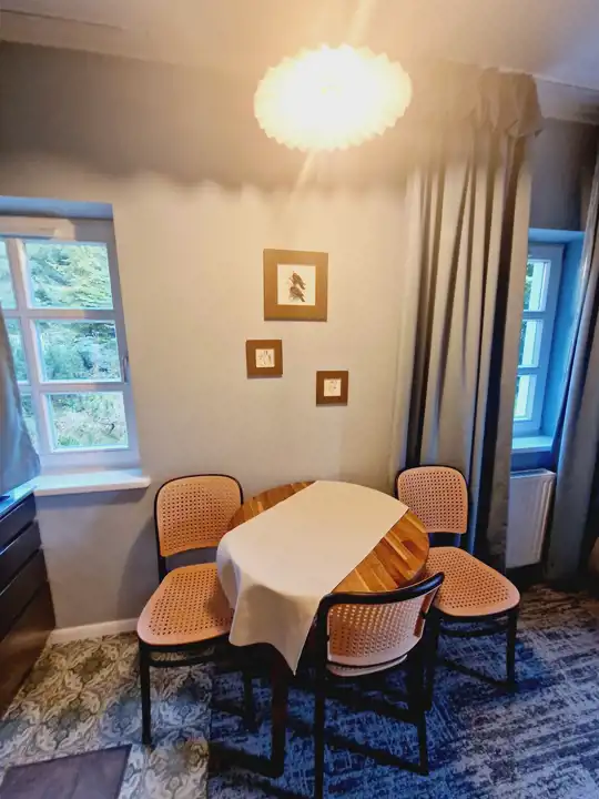 Pokój: Jasny i przestronny, z drewnianymi oknami, które wpuszczają do środka naturalne dzienne światło. Z pokoju jest przejście do aneksu kuchennego. Przestrzeń pokoju została urządzona w nowoczesnym stylu z akcentami tradycyjnych dla tego regionu elementami, które nadają mu przytulnego charakteru. Pomieszczenie ogólnie przytulne, urządzone i zaprojektowane z myślą o wygodzie i relaksie.