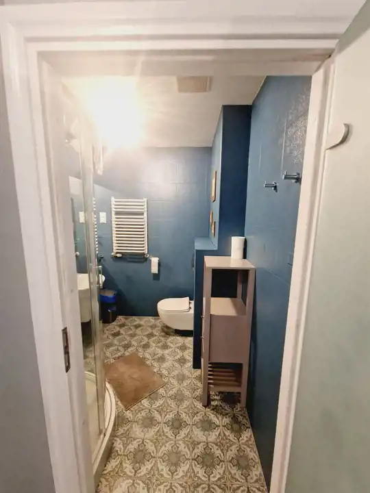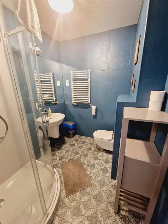 Łazienka: Nowoczesna i funkcjonalna, z elegancką armaturą oraz przestrzenią do przechowywania. Wysokiej jakości wykończenia, takie jak wielkoformatowe płytki i drewniane detale, tworzą luksusową atmosferę.