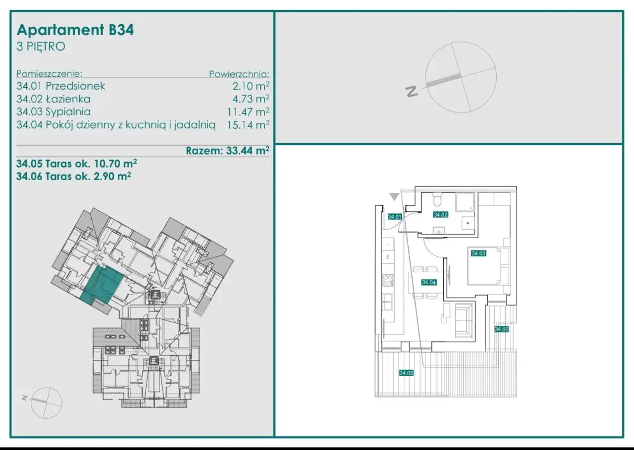 Apartament B34 o powierzchni 33,4 m2 zlokalizowany na 3 piętrze składa się z: