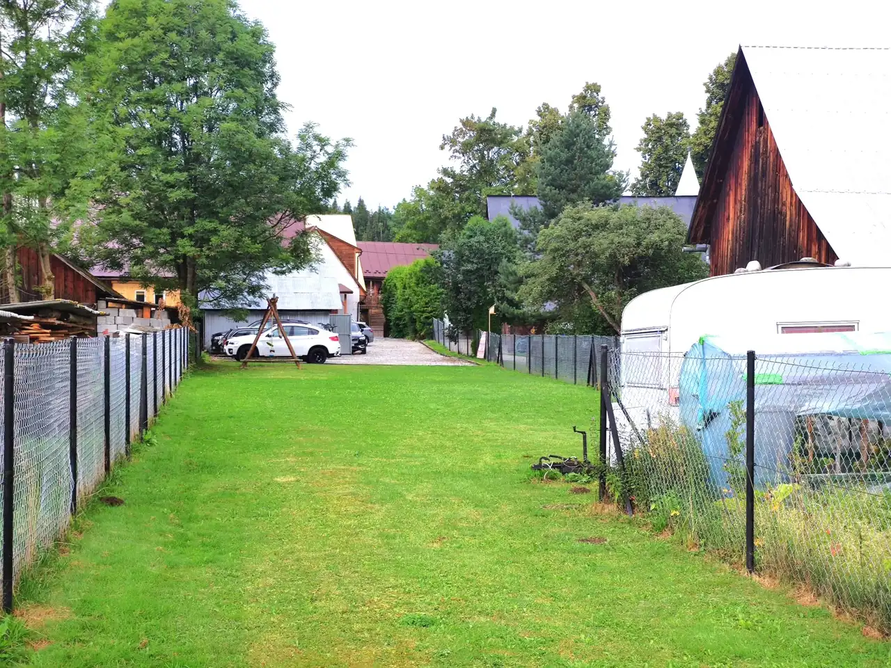 - Dodatkowe zabudowania: garaż blaszany (typowo gospodarczy) znajdujący się na końcu działki oraz garaż drewniany 3x6 m - usytuowany bliżej pensjonatu (ściany i dach z blachy, podwyższenie obite deską).