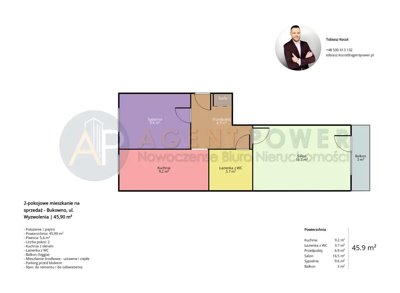 Agent Power Nieruchomości prezentuje 2-pokojowe mieszkanie w Bukownie przy ul. Wyzwolenia – idealne dla osób szukających wygody, spokoju i świetnej lokalizacji.