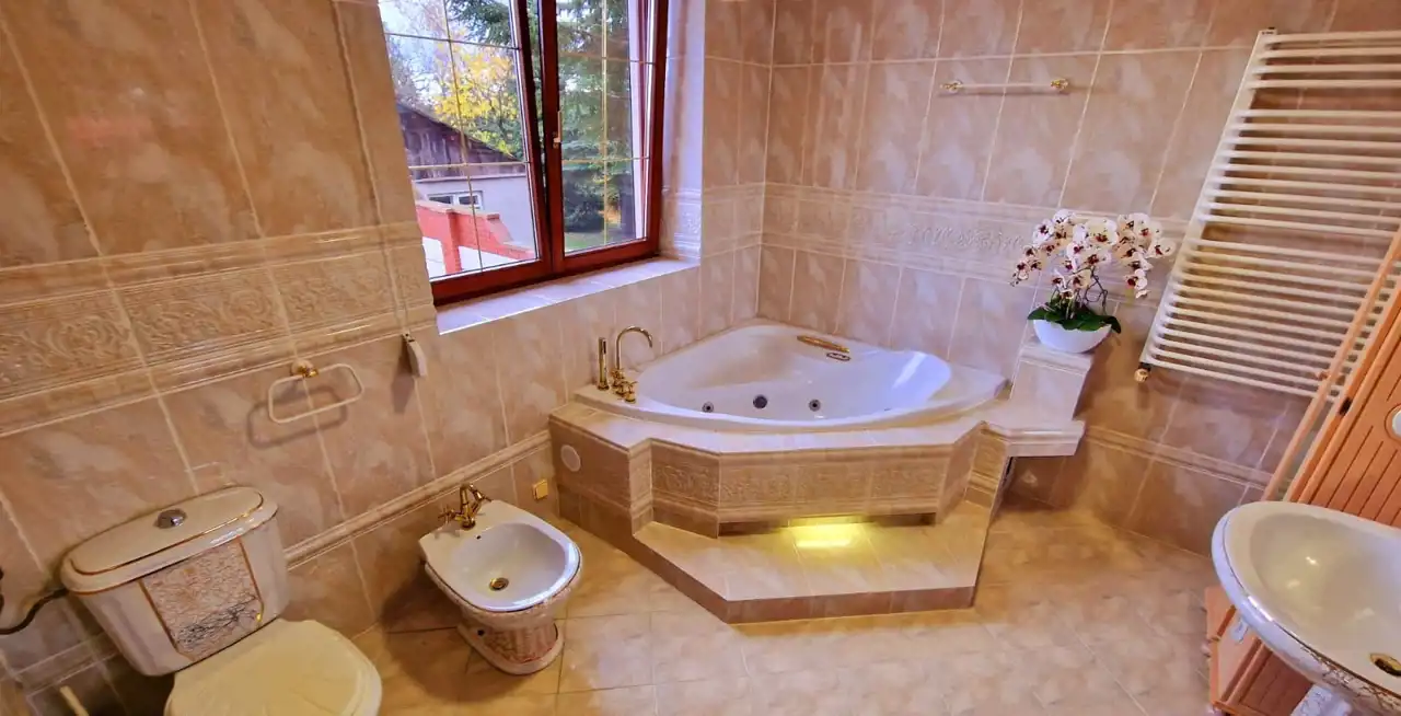 The house is built of ceramic blocks, insulated with styrofoam, with a metal roof, and heated by a dual-function gas boiler. The building is equipped with air conditioning installation and partial underfloor heating.