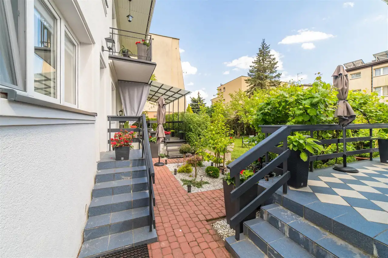 Działka zagospodarowana o pow. 684m2 w kształcie prostokąta, z licznymi nasadzeniami drzew i krzewów zapewniających prywatność, możliwość parkowania przy budynku.