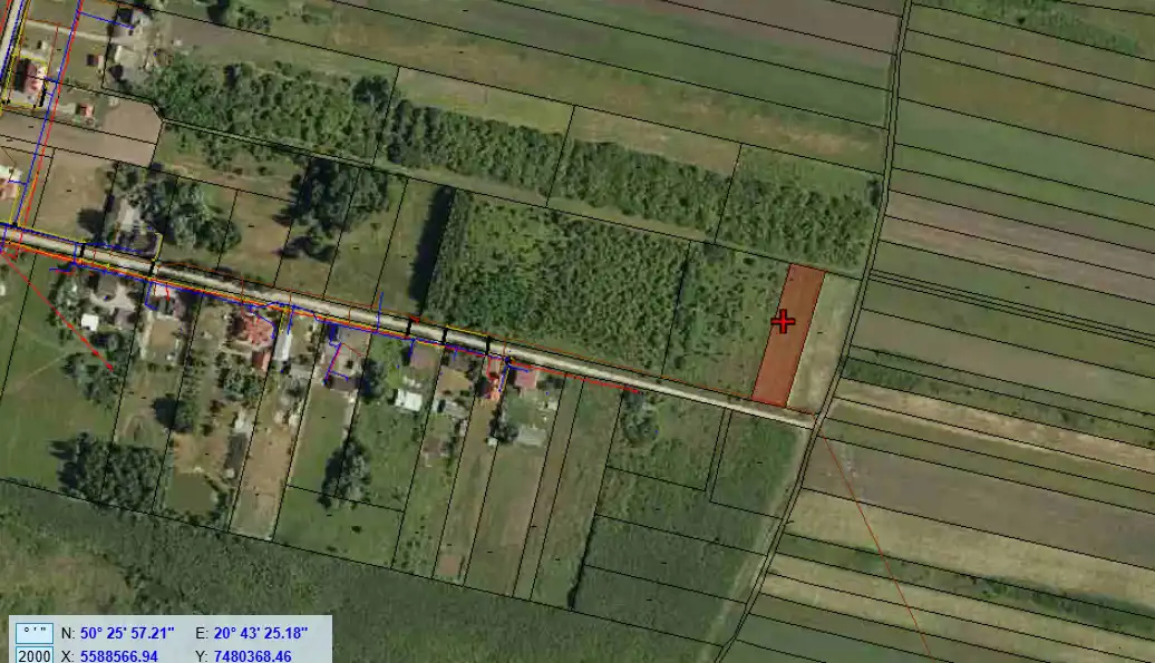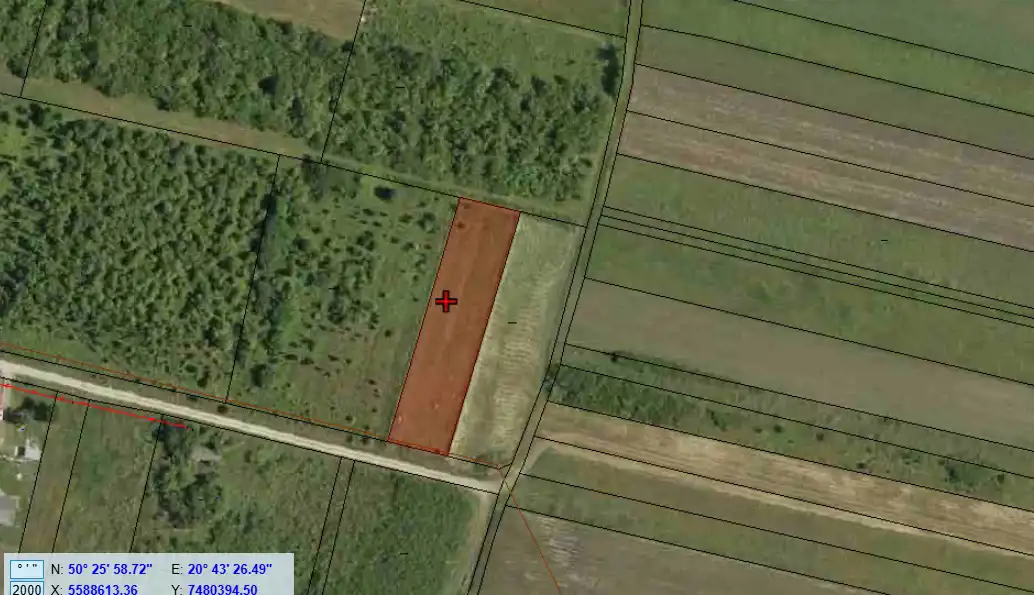 For sale: a 1,988 m² plot located in the village of Wolica, right next to Busko-Zdrój. The plot measures approximately 21 x 91 meters, with a frontage width of about 21 meters. It is fenced and undeveloped, with access via a paved road.
