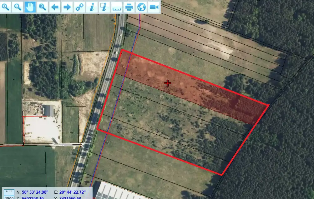 A rectangular, flat, undeveloped agricultural plot of land with an area of 60,642 m², located in the village of Młyny, Busko-Zdrój municipality, directly adjacent to national road No. 73.