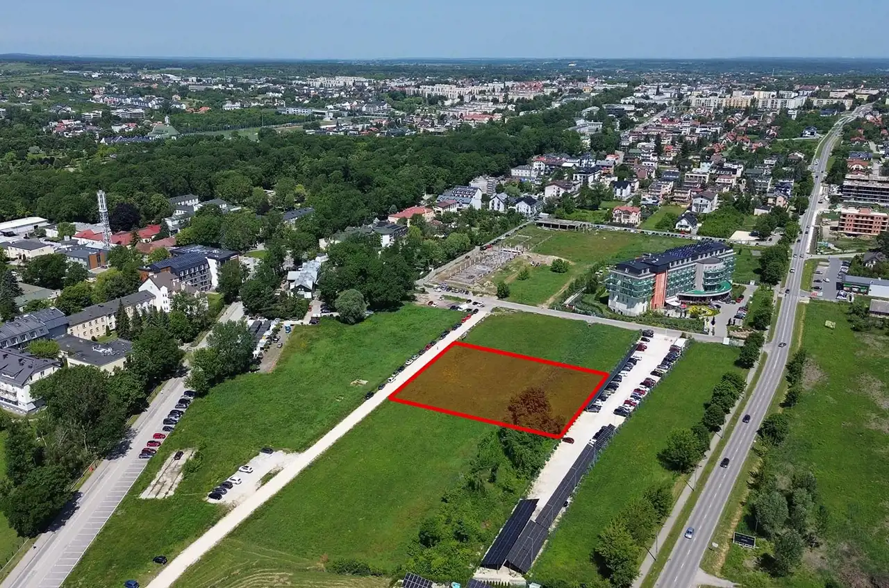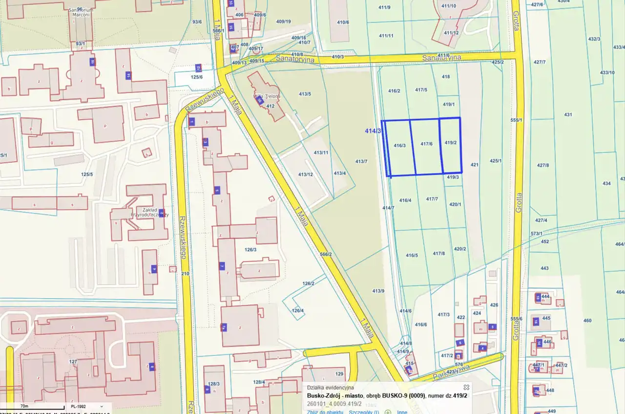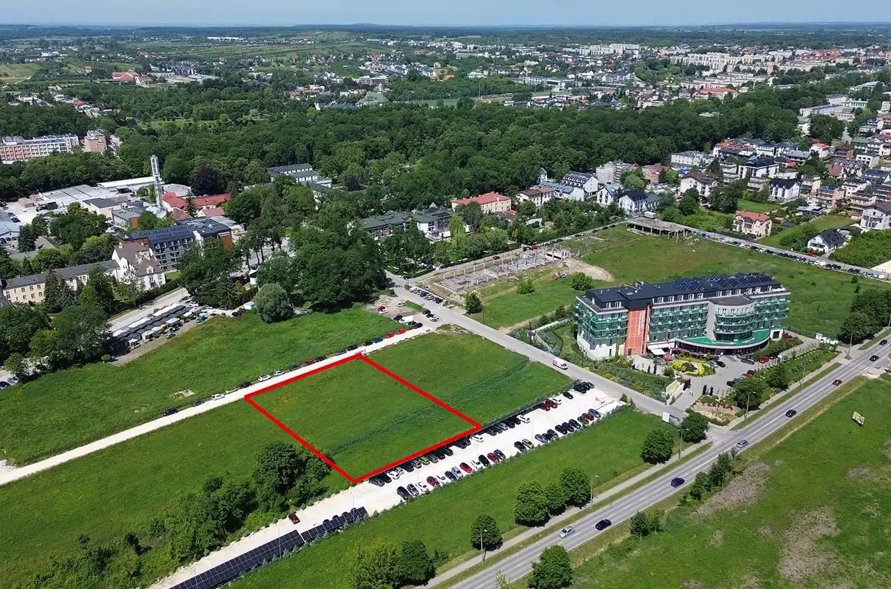 For sale: investment plot with an area of 3,426 m² located in Busko-Zdrój, near 1 Maja and Grotta streets. The plot is flat, rectangular in shape, undeveloped, and not fenced.