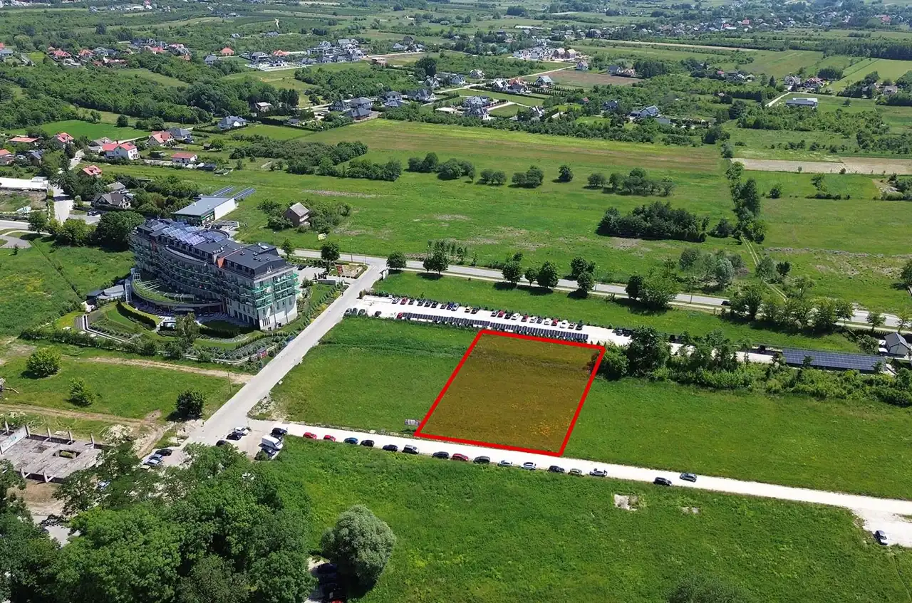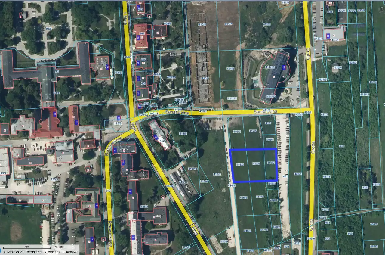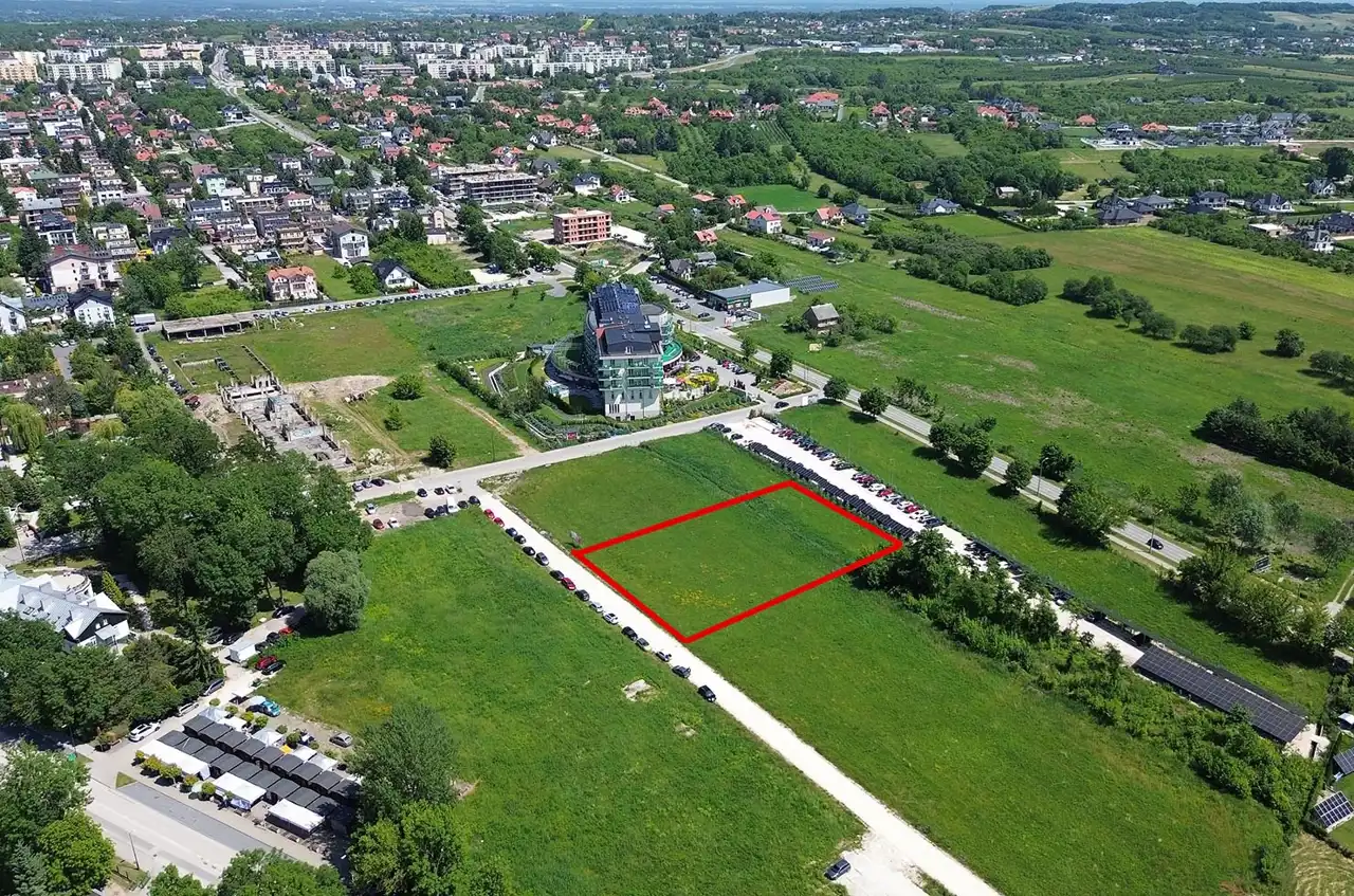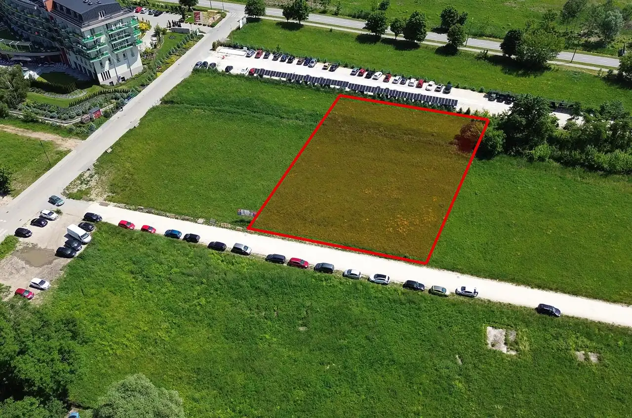For sale: investment plot with an area of 3,426 m² located in Busko-Zdrój, near 1 Maja and Grotta streets. The plot is flat, rectangular in shape, undeveloped, and not fenced.