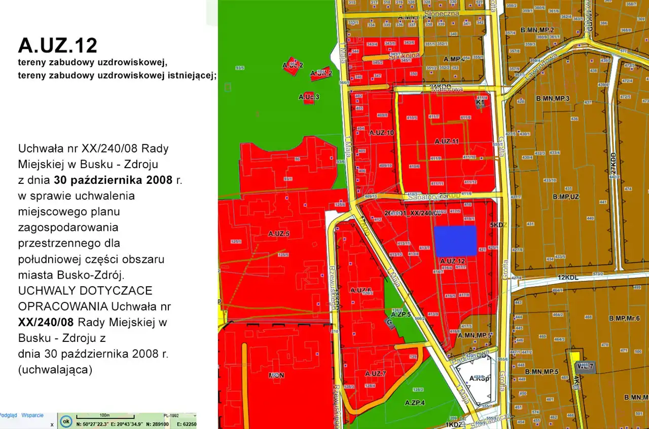 Teren na którym znajduje się działka jest objęty Miejscowym Planem Zagospodarowania Przestrzennego – oznaczony jako A.UZ.12 – tereny zabudowy uzdrowiskowej.