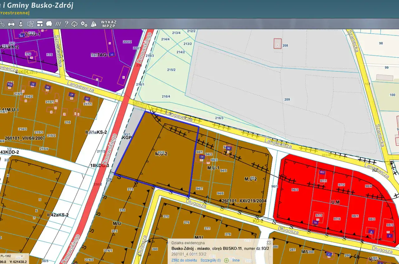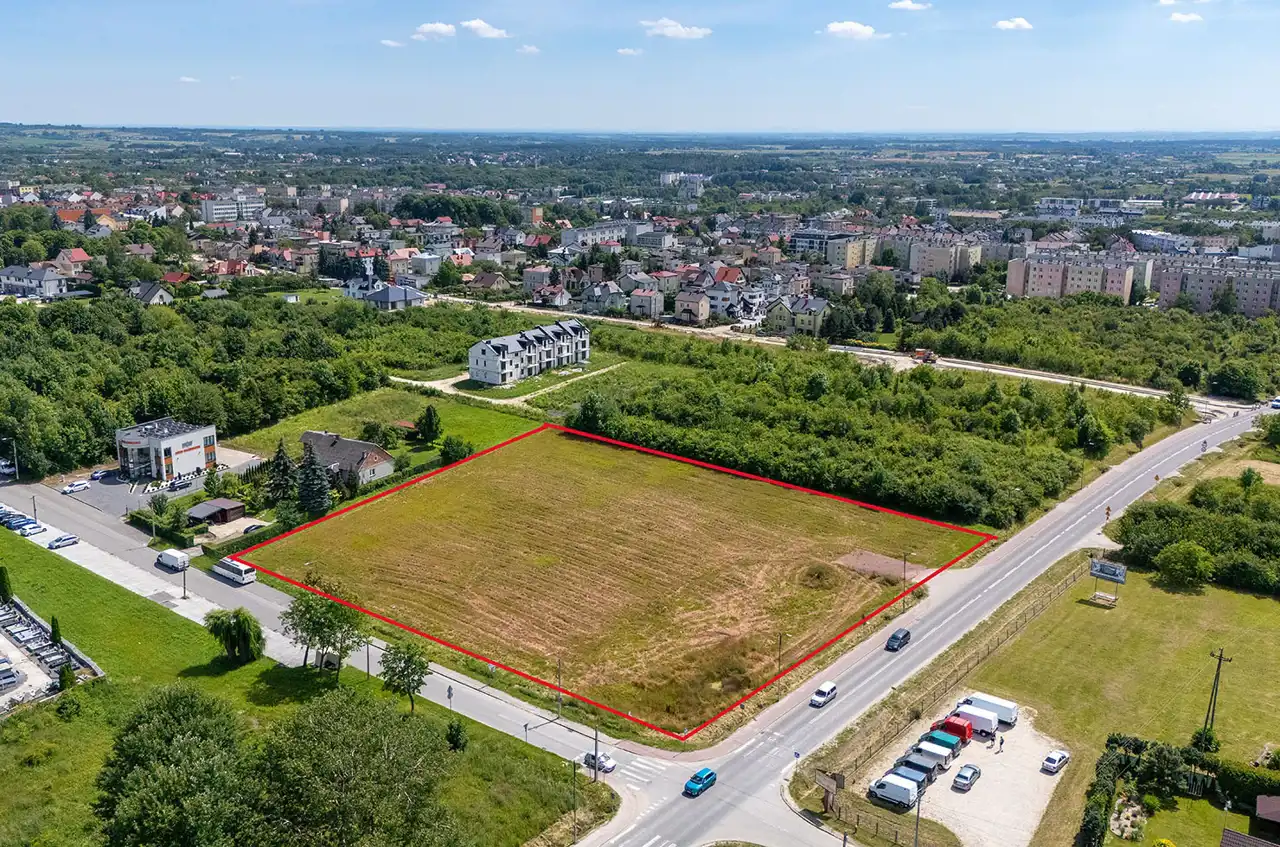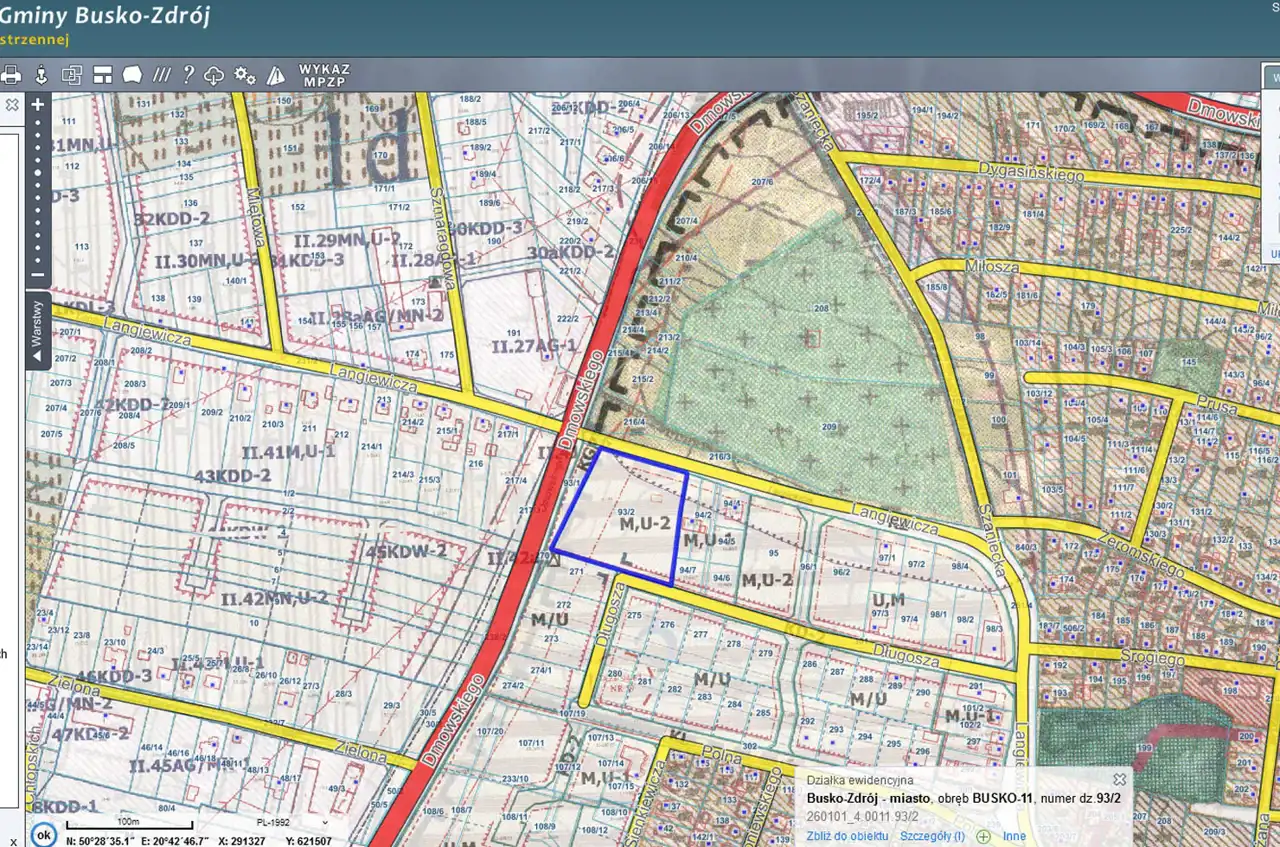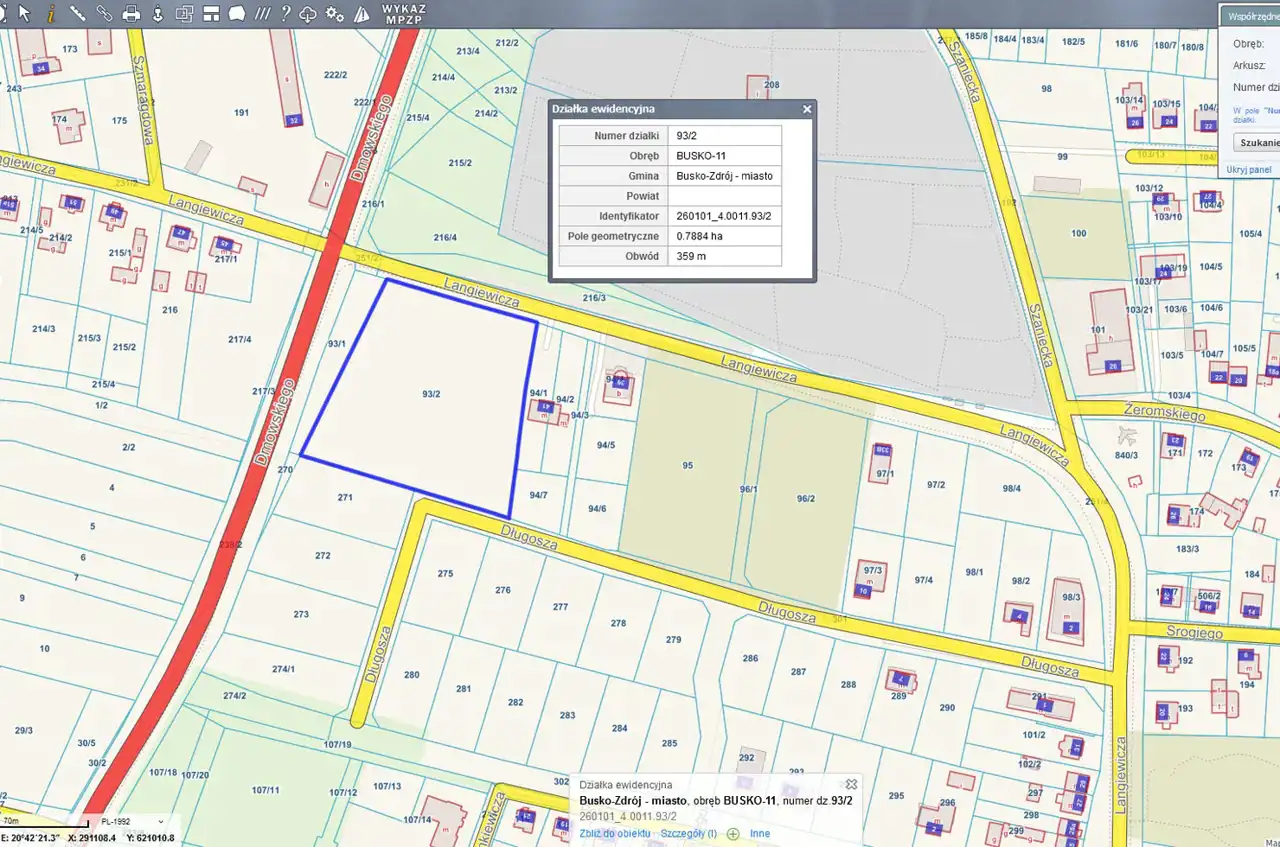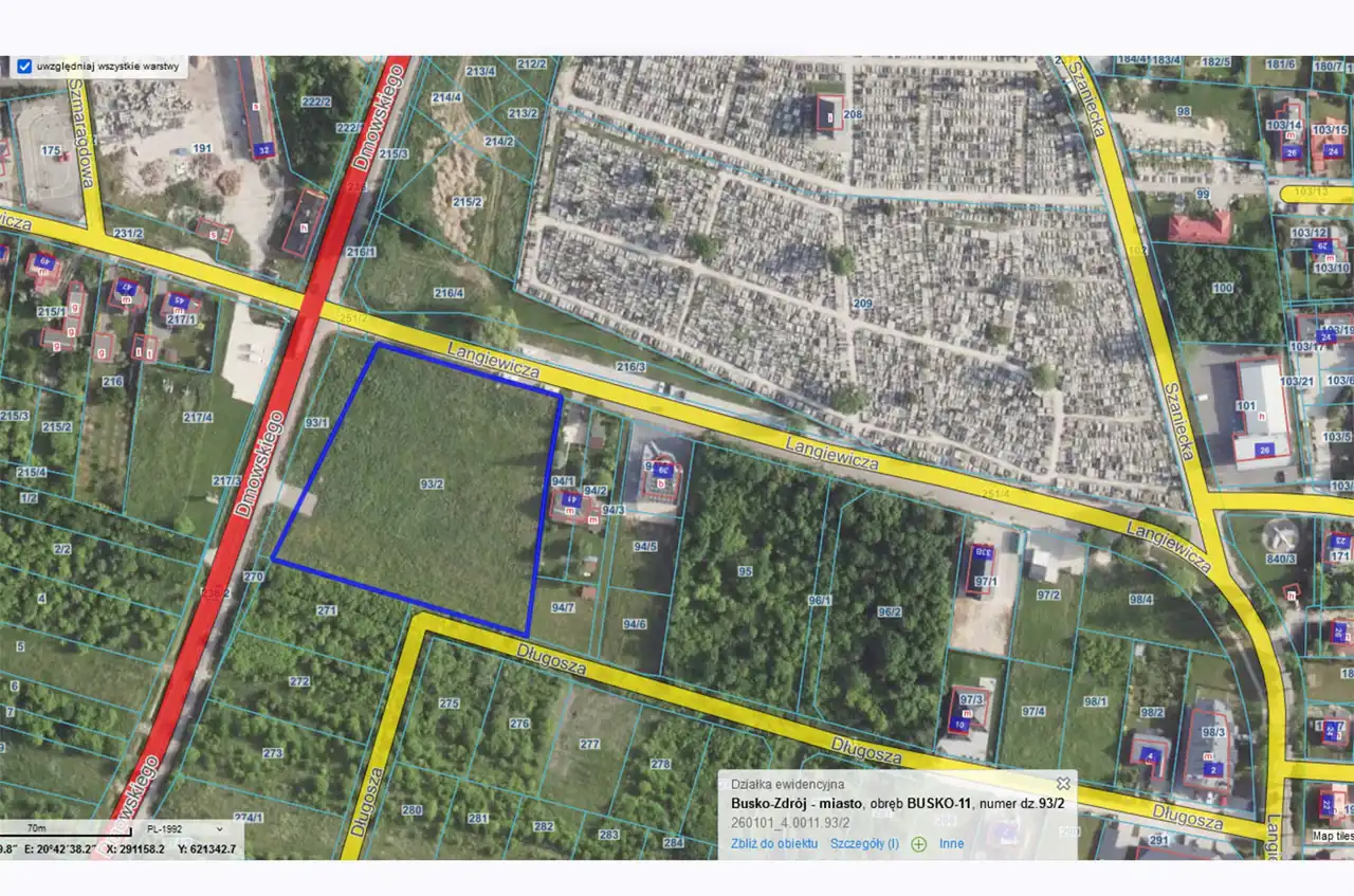 For Sale: A plot of land with an area of 7,892 m² located in Busko Zdrój, at the intersection of Langiewicza and Dmowskiego streets. The plot is flat, corner-shaped, and trapezoidal, situated on the provincial road number 973, with an access road from Dmowskiego Street.