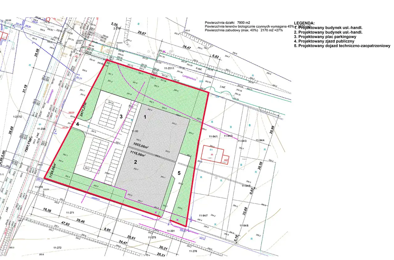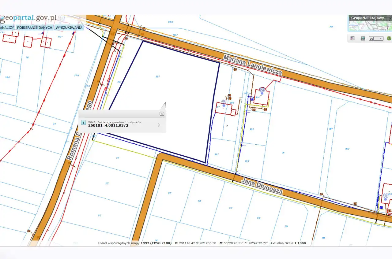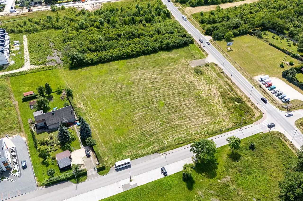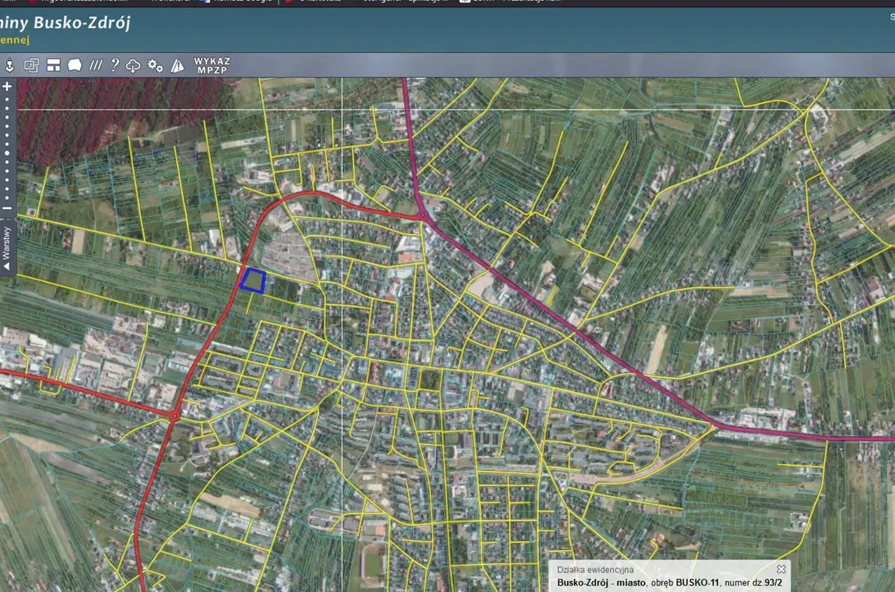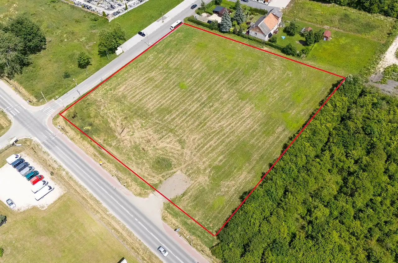 For Sale: A plot of land with an area of 7,892 m² located in Busko Zdrój, at the intersection of Langiewicza and Dmowskiego streets. The plot is flat, corner-shaped, and trapezoidal, situated on the provincial road number 973, with an access road from Dmowskiego Street.