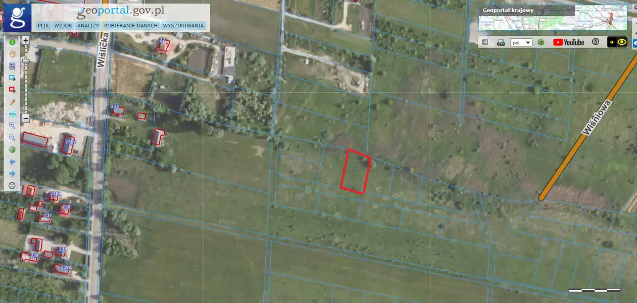 For Sale: Plot of land with an area of 1221 square meters located in Siesławice, Busko-Zdrój municipality. The plot has approximate dimensions of about 30 x 38 x 30 x 42 meters, it's flat, undeveloped, and unfenced. Access is via an unpaved road (approximately 380 meters from the asphalt road).