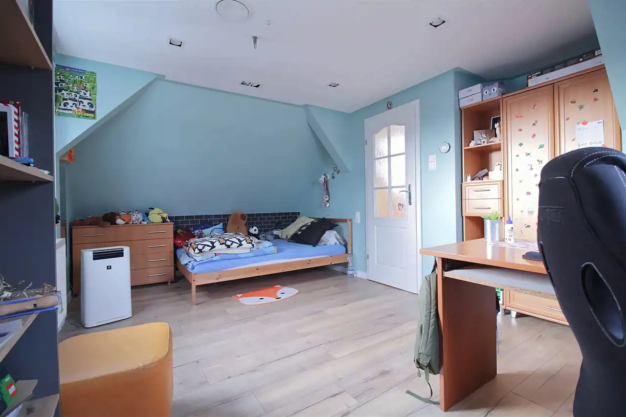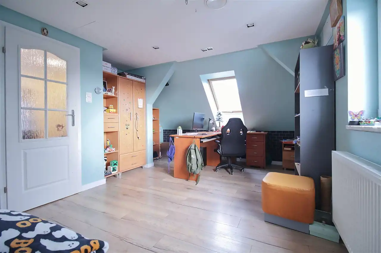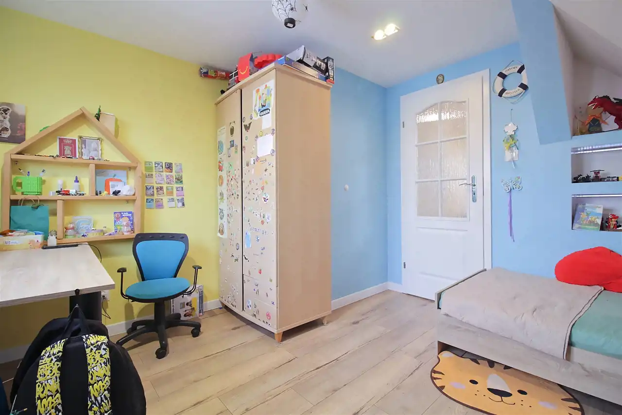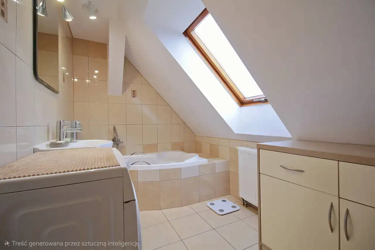 Na piętrze znajdują się dwa pokoje, dużo przestrzeni do przechowywania oraz łazienka z wanną