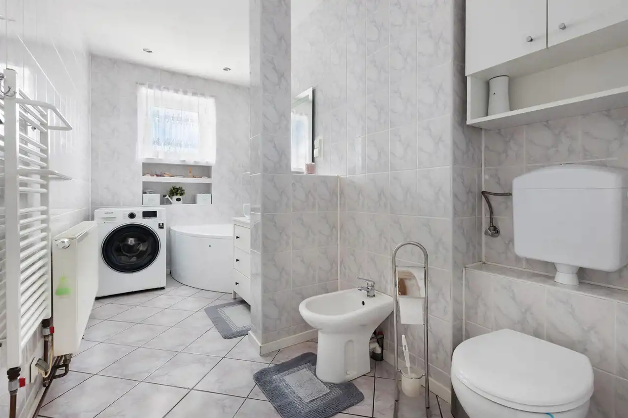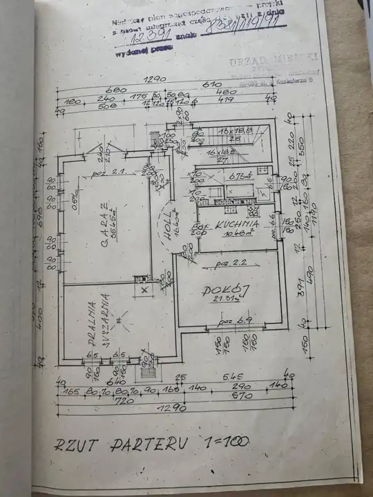 Parter (120,55m2): kuchnia, dwa pokoje, łazienka z WC, holl + garaż w bryle budynku (35,45) oraz pralnia;