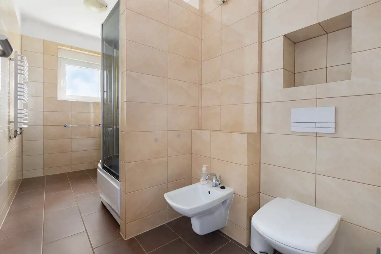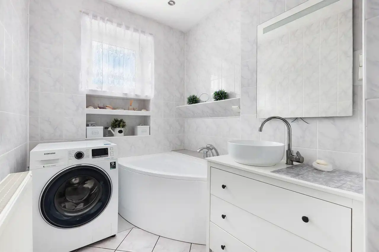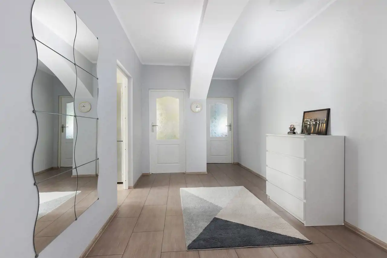 Ściany – gładź gipsowa, płytki ceramiczne w łazienkach i kuchni;