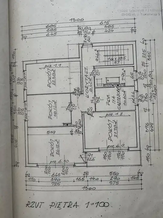 Piętro (156m2): kuchnia, łazienka z WC, cztery pokoje, łazienka z WC, spiżarnia, holl.