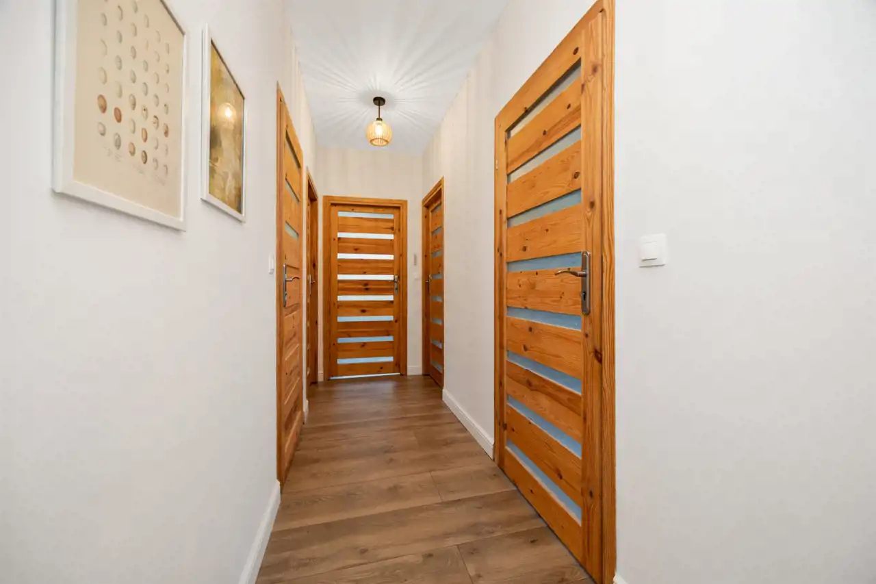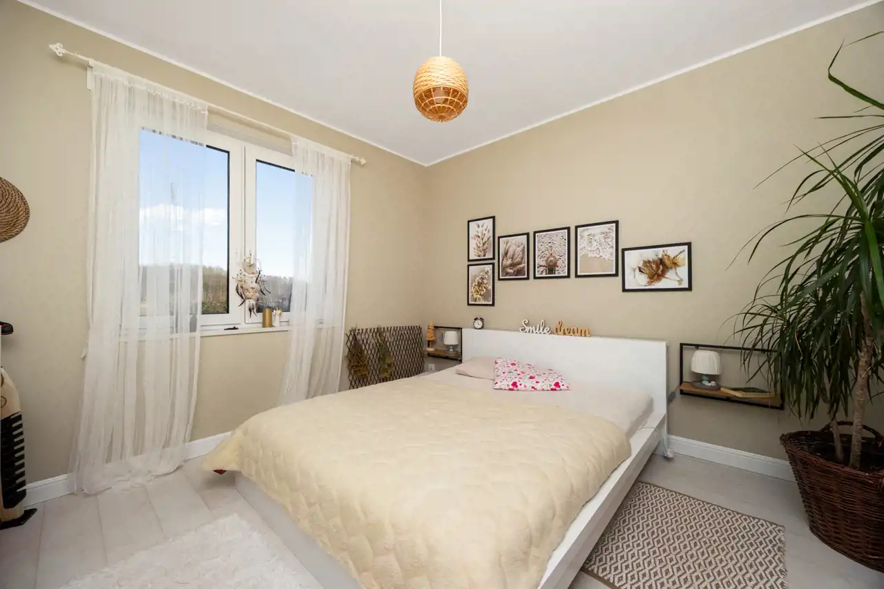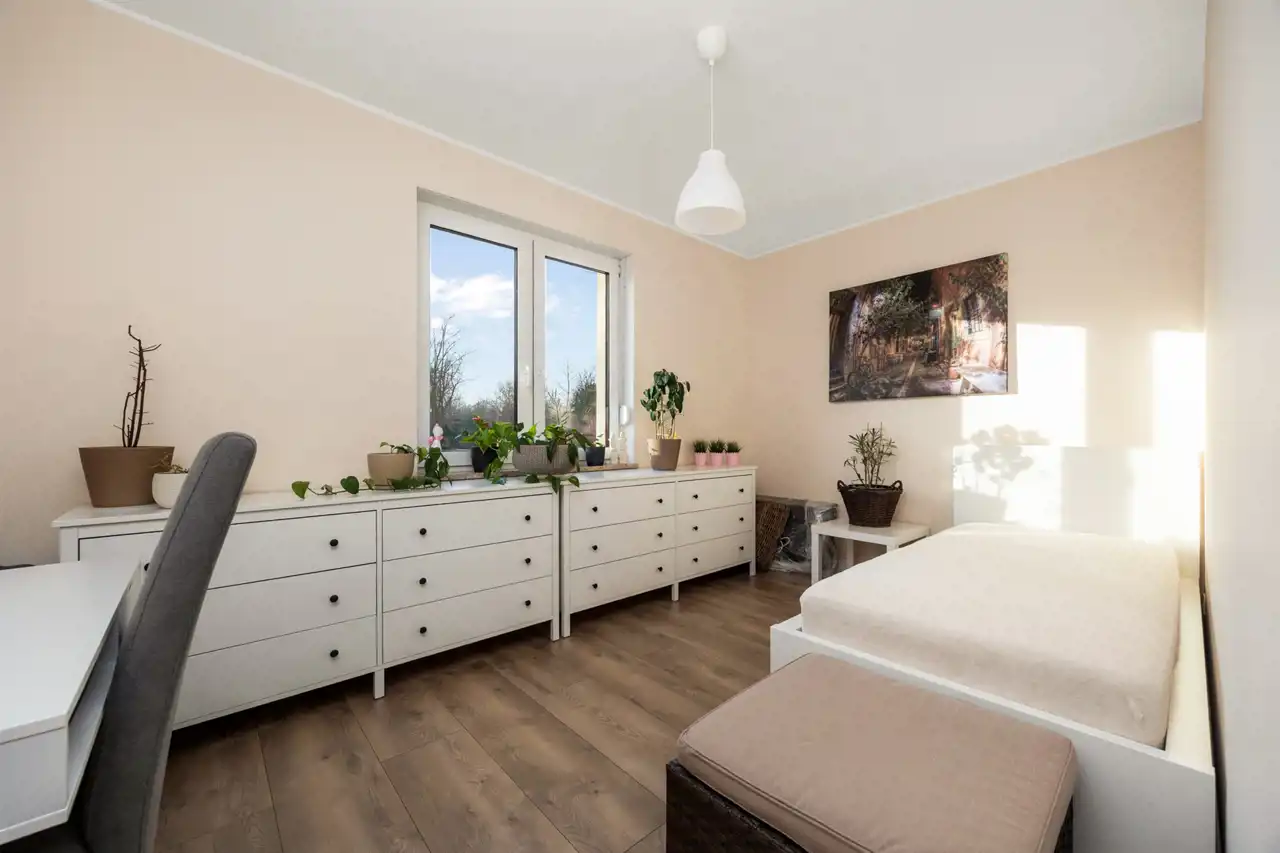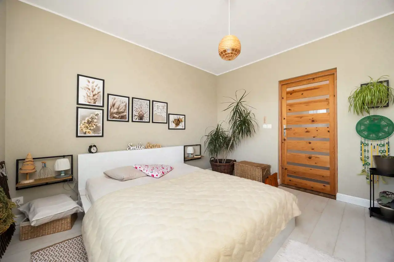 Dom oferuje cztery oddzielne pokoje, które mogą pełnić funkcję sypialni, pokoju dziecięcego, gabinetu lub dodatkowej przestrzeni gościnnej. Jedna z sypialni została wyposażona w zabudowane szafy garderobiane, zapewniające wygodne i estetyczne miejsce do przechowywania.