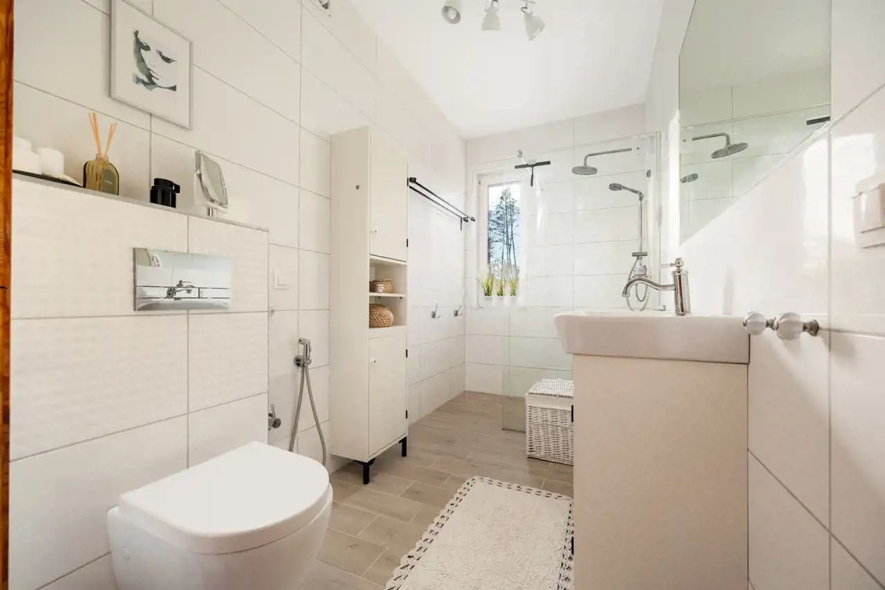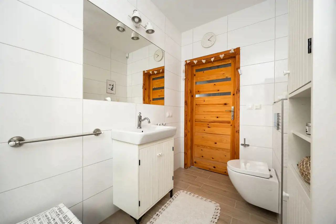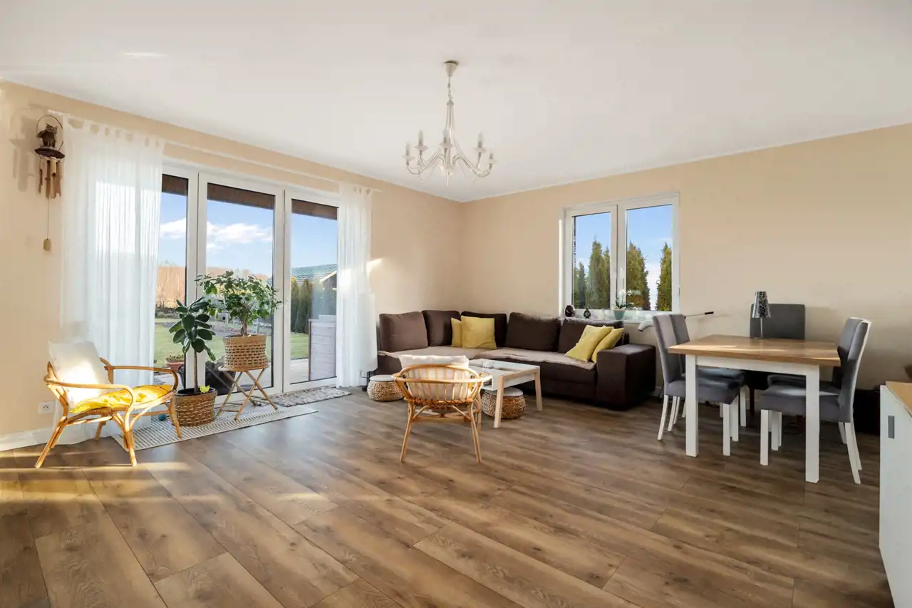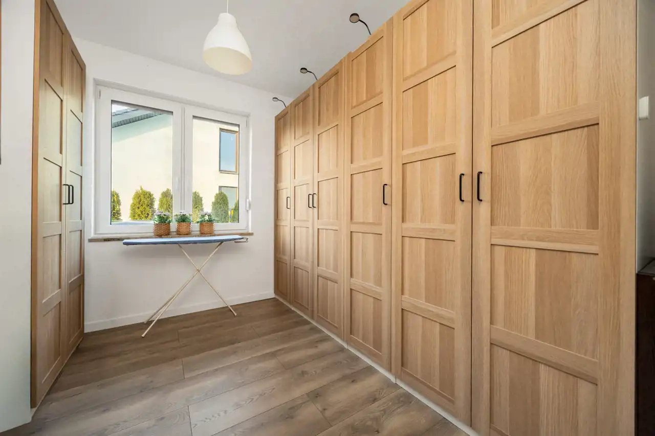Dom oferuje cztery oddzielne pokoje, które mogą pełnić funkcję sypialni, pokoju dziecięcego, gabinetu lub dodatkowej przestrzeni gościnnej. Jedna z sypialni została wyposażona w zabudowane szafy garderobiane, zapewniające wygodne i estetyczne miejsce do przechowywania.