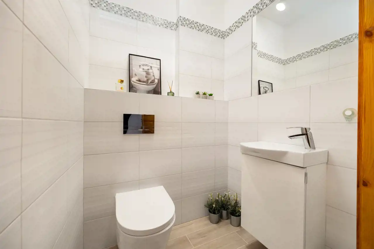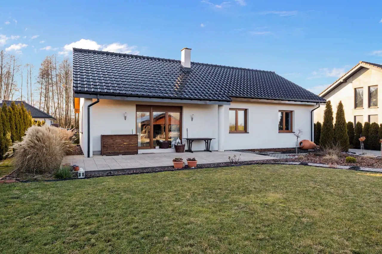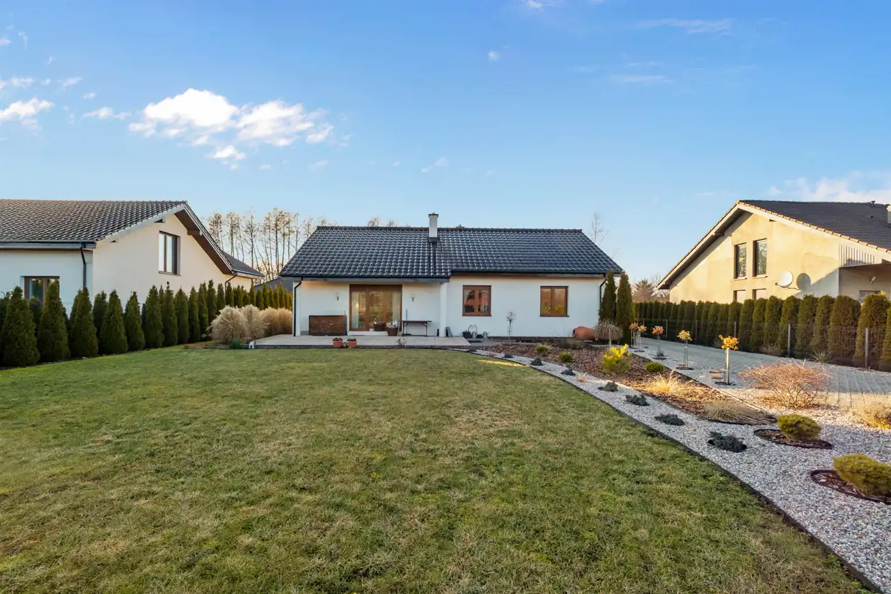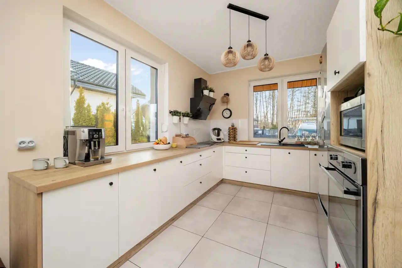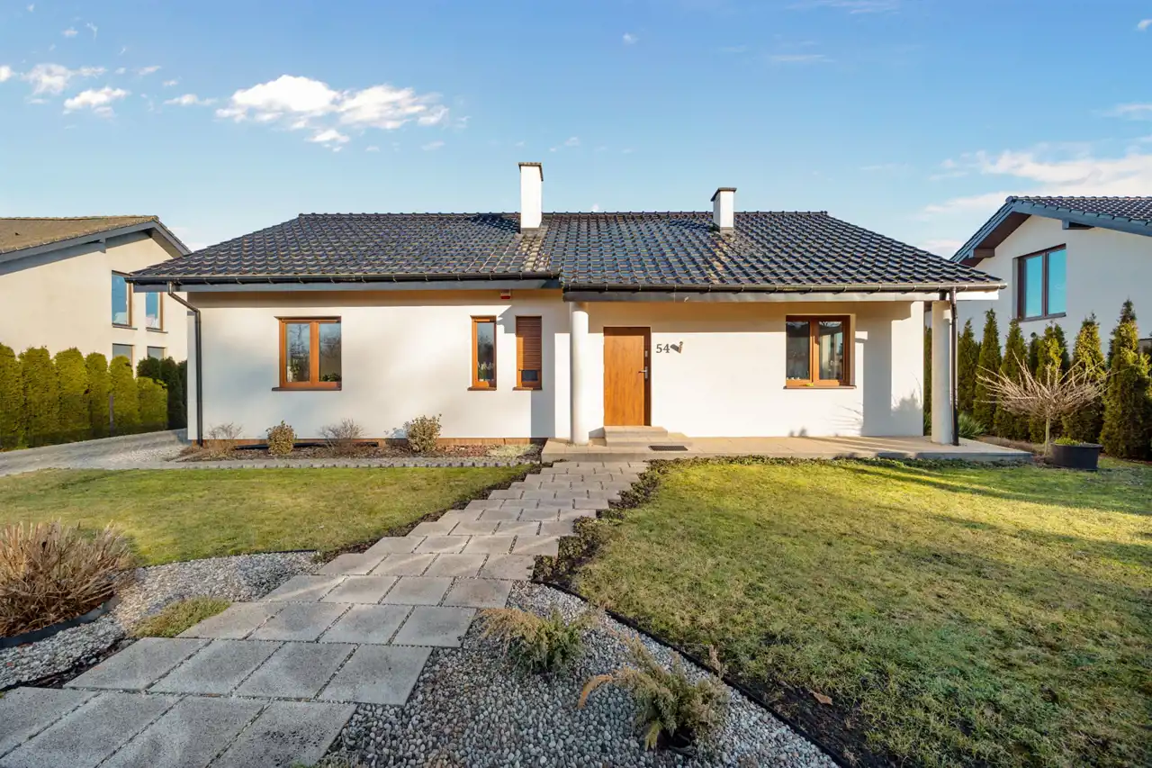 Wybudowany na przełomie 2018/2019 roku, nowoczesny, elegancki i dopracowany w każdym detalu. Położony na pięknie zagospodarowanej działce o powierzchni 1300 m², w kameralnej, ślepej uliczce, w otoczeniu spokojnego sąsiedztwa — zapewnia prywatność, bezpieczeństwo i komfort codziennego życia.
