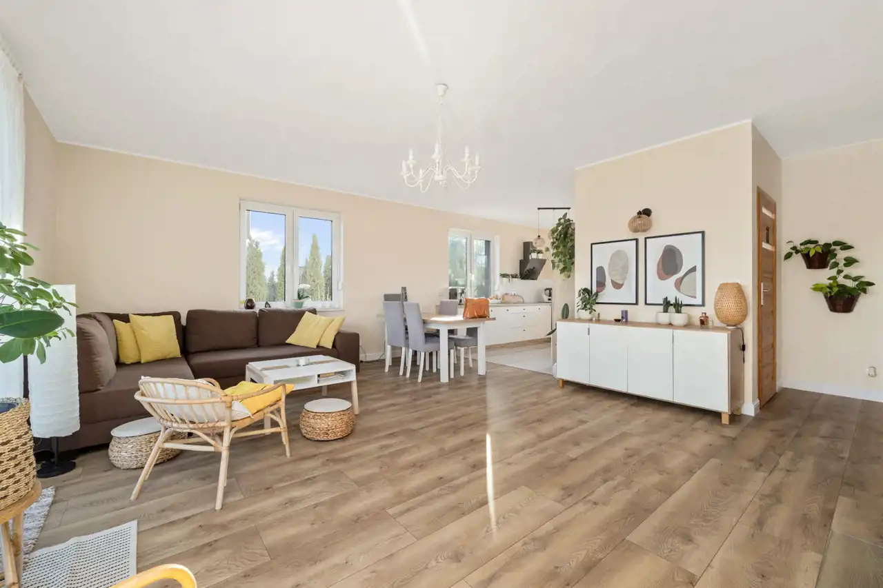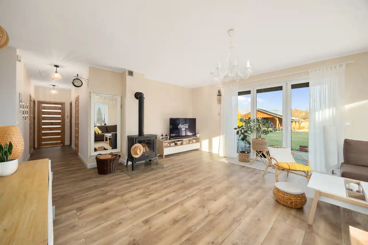 Powierzchnia domu to 111 m². Wnętrze zostało zaprojektowane funkcjonalnie i harmonijnie, z dbałością o jakość wykończenia oraz ciepły, przytulny charakter.