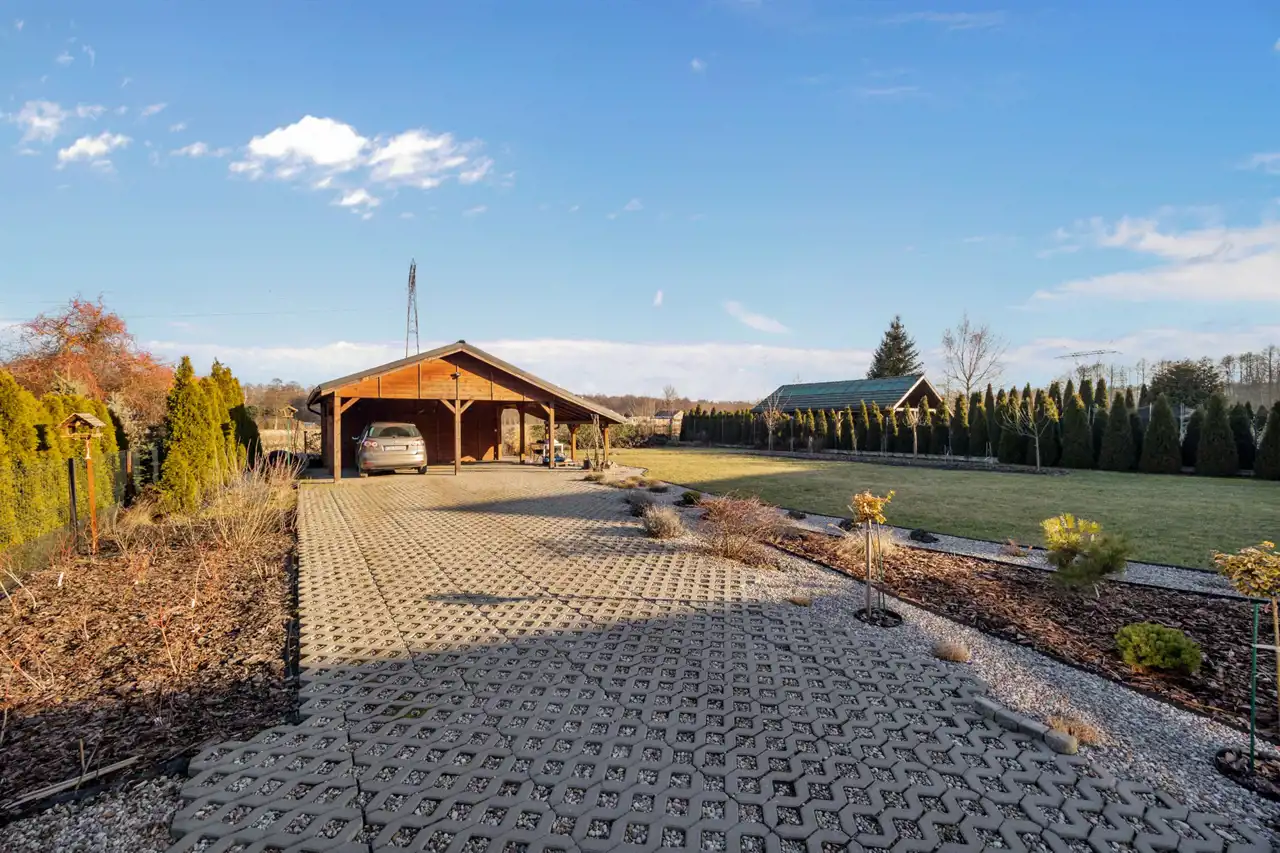 Na posesji znajduje się również wiata na dwa samochody oraz schowek na sprzęty ogrodowe lub rowery..