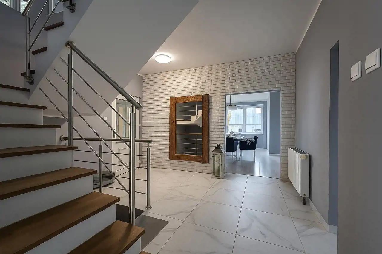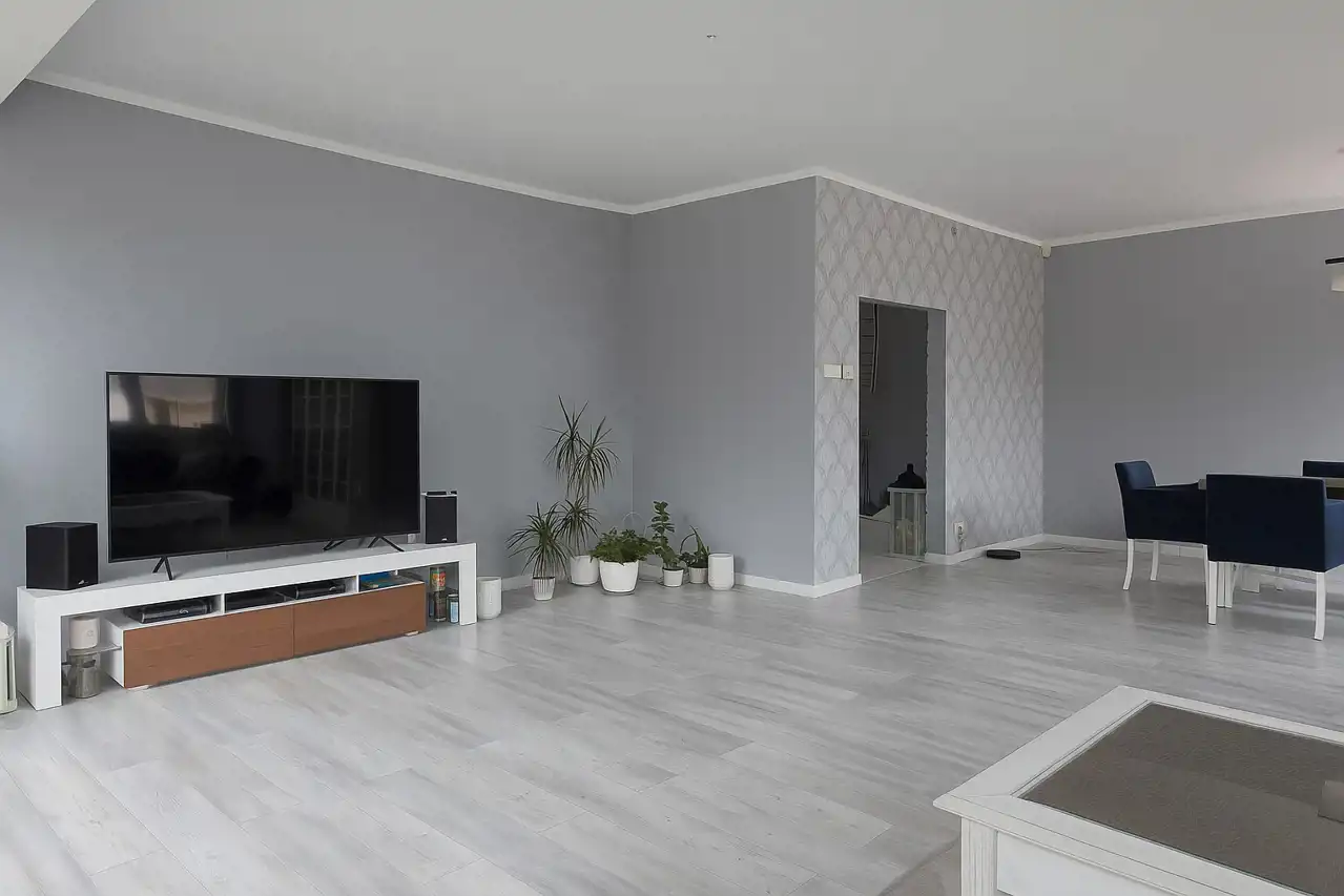 Już od progu wita Cię przestronny przedsionek, w którym wygodnie przechowasz buty i okrycia wierzchnie. Dalej otwiera się imponująca przestrzeń dzienna — ogromny salon z jadalnią, pełen naturalnego światła, idealny do rodzinnych spotkań czy przyjęć ze znajomymi.