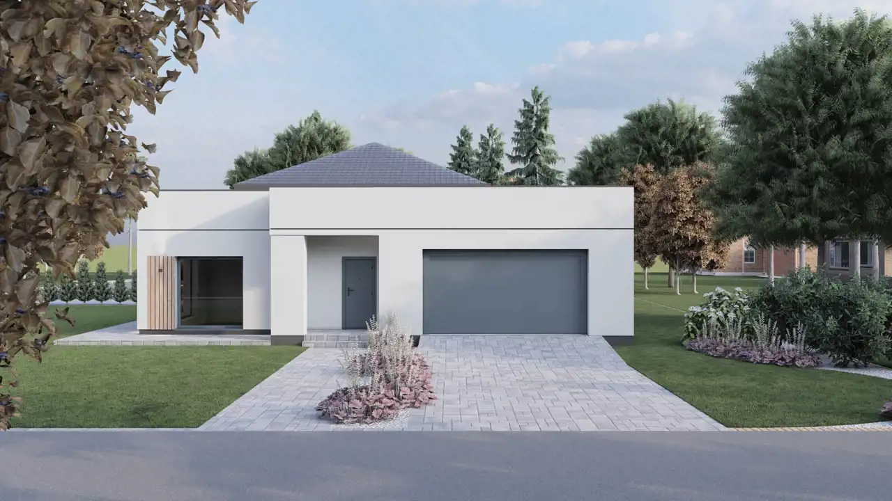 W bryle jednopoziomowego parterowego lokalu znajdziemy przestronną kuchnię z jadalnią i salonem, łazienkę, wc, oraz wiatrołap i garderobę. Obok jest garaż wraz z pomieszczeniem gospodarczym. Na wszystkich oknach zostaną zamontowane rolety elektryczne. W salonie zamontowane są wielkoformatowe okna marki Schüco oraz wyjście na przepiękny wybrukowany taras. Ta sama kostka zostanie użyta do wybrukowania podjazdu, wejścia do budynku oraz opaski na bokach domu. Do domu prowadzą drzwi antywłamaniowe KNT.