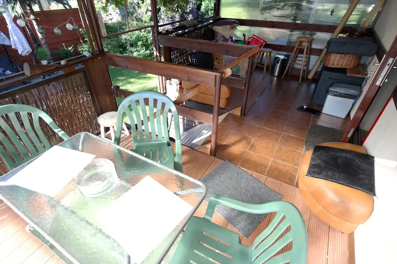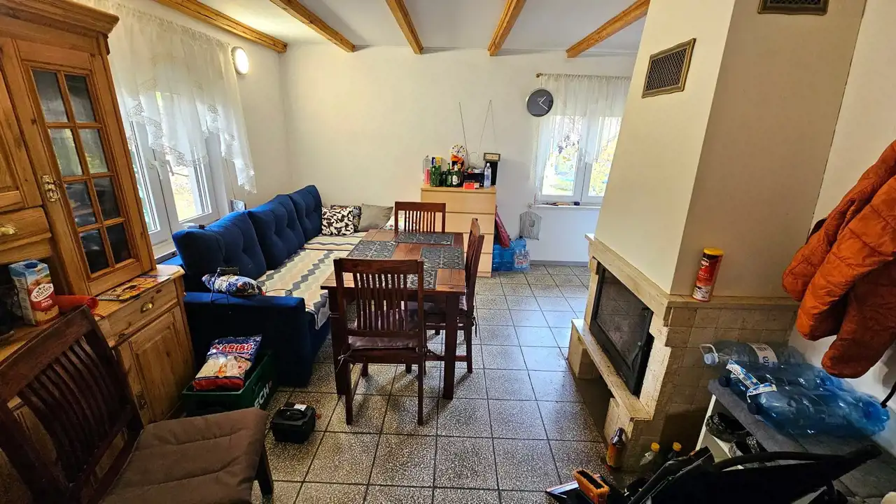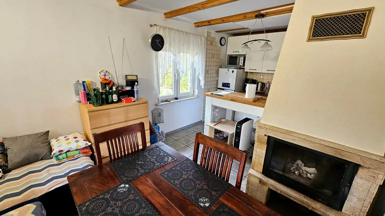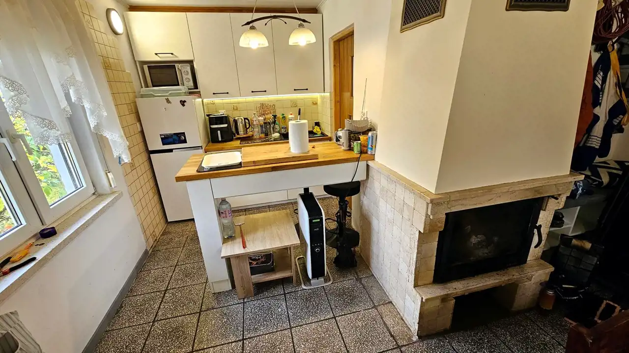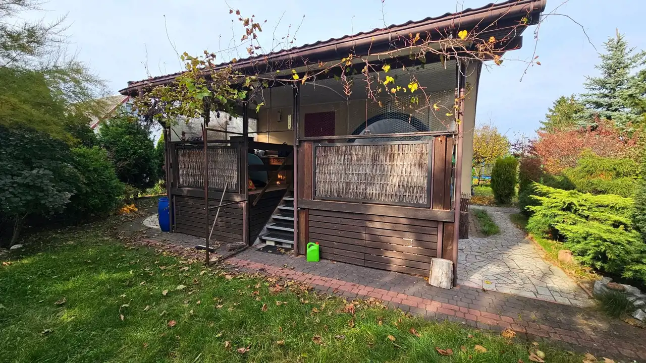 Domek jest wykonany bardzo starannie. 28 m2 pierwsza kondygnacja plus 23 m2 piwnica i 23 m2 poddasze. Aneks kuchenny. Do zamieszkania od zaraz. Ściany wykonane z bloczków, suporeksu. Okna PCV. Na dachu blacho dachówka. Rynny PCV. Salon, kuchnia, łazienka kafle. W salonie kanapa, stoły, krzesła. Wyposażona kuchnia. Zabudowa kuchenna, kuchenka, lodówka, zlew, bojler elektryczny, mikrofalówka, pralka. Duża łazienka z kabiną prysznicową. Pralka. Ogrzewanie kominek z rozprowadzeniem ciepła. Duży salon. Sypialnia na piętrze. Prąd, woda miejska. Włączane na cały rok. Własna studnia. Duże szambo. Działka w całości ogrodzona płotem z siatki. Zagospodarowana. Możliwość wjazdu autem. W salonie kominek. Duży taras. Na działce posadzone drzewa, kwiaty, winogrono, czereśnia, śliwy, jabłonie, wiśnie. Wyposażenie domku w cenie.