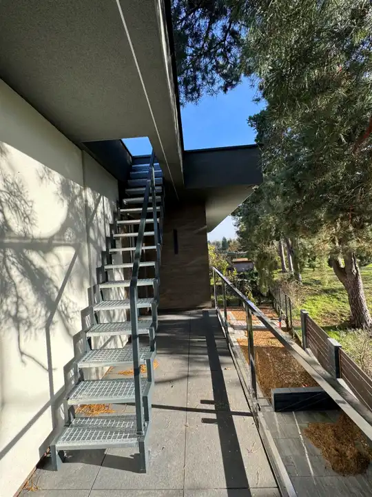 Na zewnątrz kostka brukowa, teren uporządkowany, trawa, ogrodzenie terenu.
