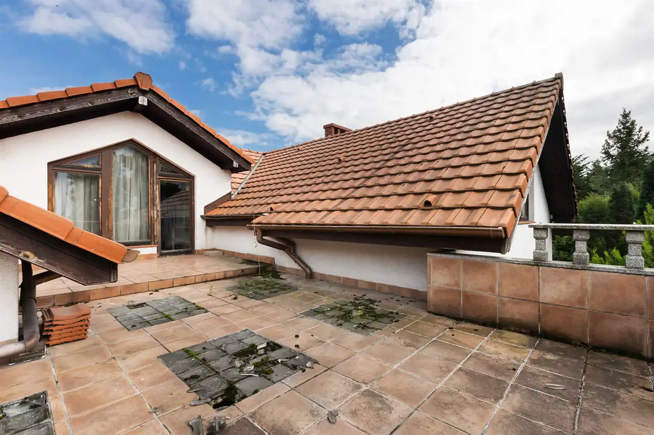 Dach: stromy, łamany o nachyleniu połaci 30 stopni pokryty dachówką ceramiczną. Rynny i rury spustowe z PCV.