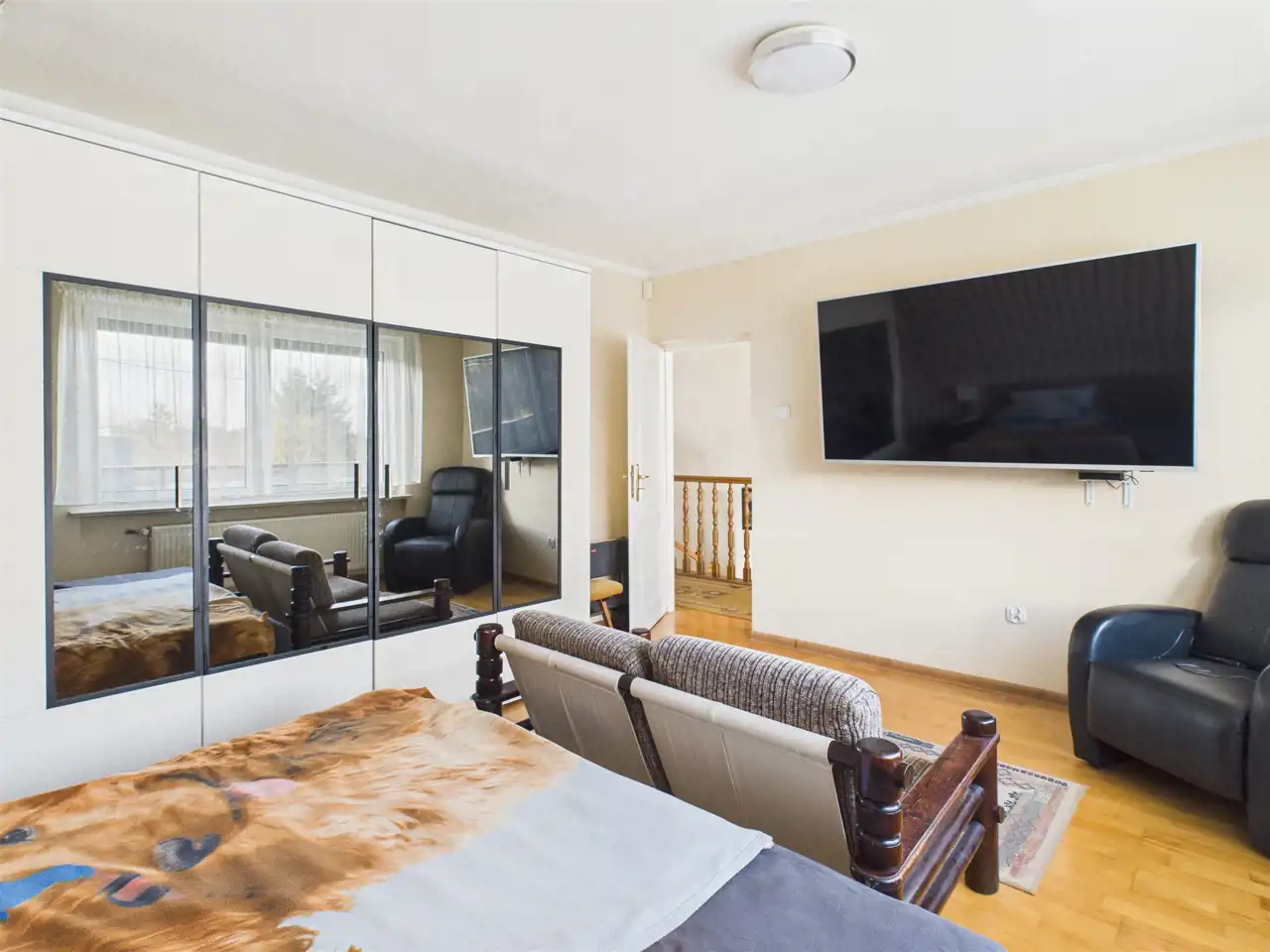 Na półpiętrze znajduje się wyjątkowo ustawna i przestronna sypialnia, która może pełnić rolę: