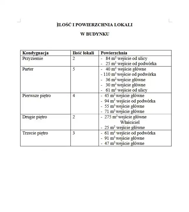Budynek o łącznej powierzchni 1450 m², wybudowany z cegły, składa się z 16 lokali mieszkalnych o zróżnicowanych metrażach – od kompaktowych 25 m² do przestronnych 275 m², z czego część mieszkań jest aktualnie wynajmowana, co stanowi natychmiastowy dochód pasywny.