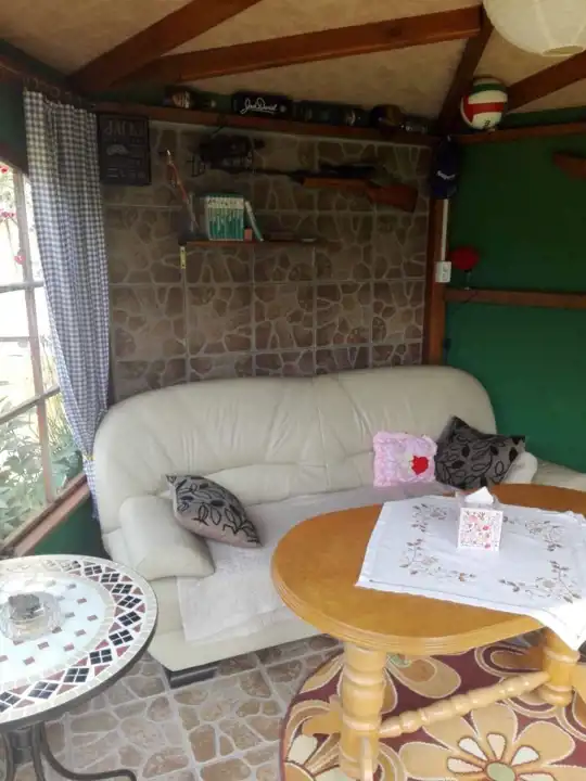 Powierzchnia domu to 40m2, na które składają się sypialnia, salon, łazienka, kuchnia, przedpokój i kotłownia (w tej chwili przy piecu gazowym, który zajmuje mniej miejsca, kotłownia pełni bardziej rolę spiżarni/suszarni). Pozostałe 40m2 , czyli dwa garaże blaszane oraz ok 6m2 altana, całkowicie zabudowana ogrzewana kominkiem elektrycznym.
