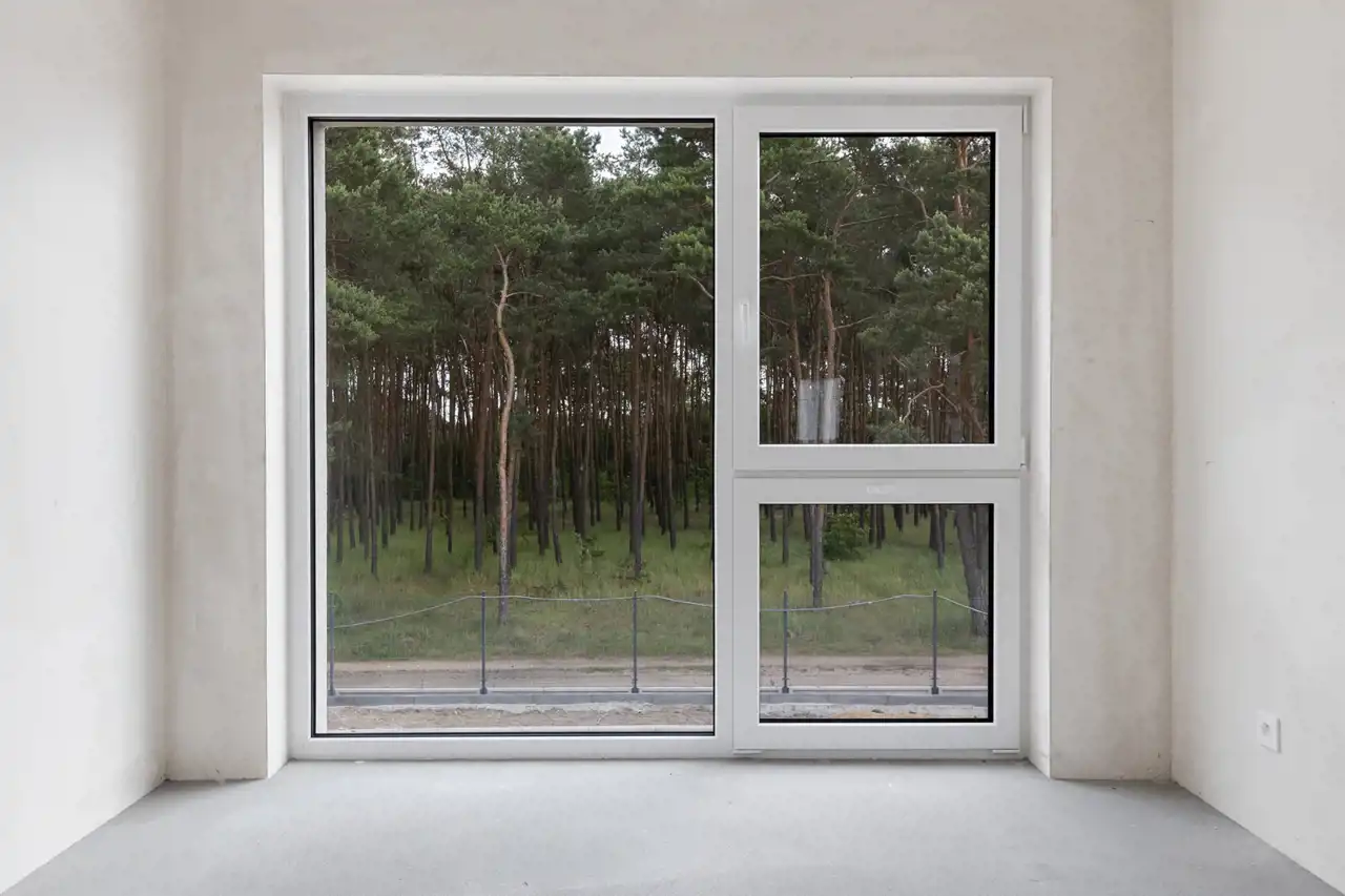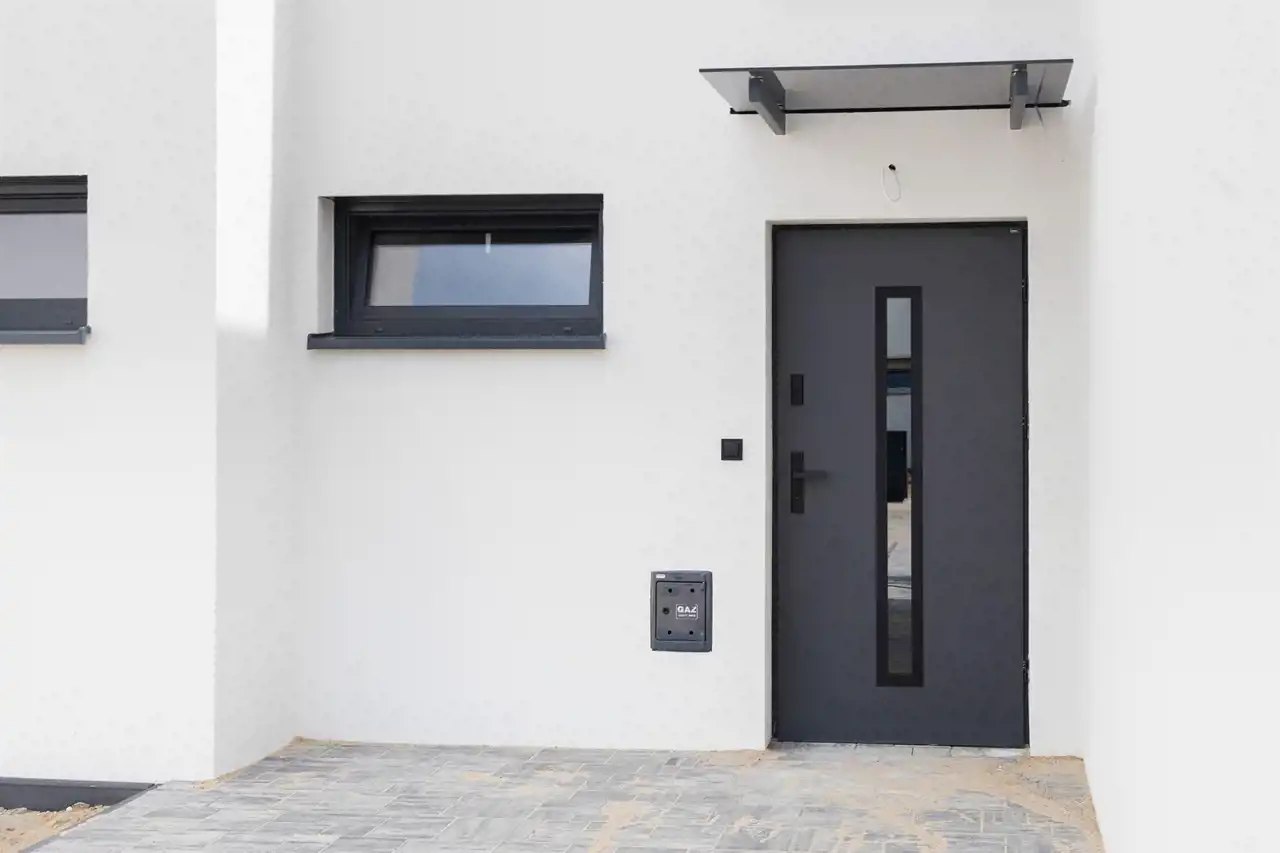 - płaski dach, okna PCV 3-szybowe Schüco, parapety zewnętrzne stalowe