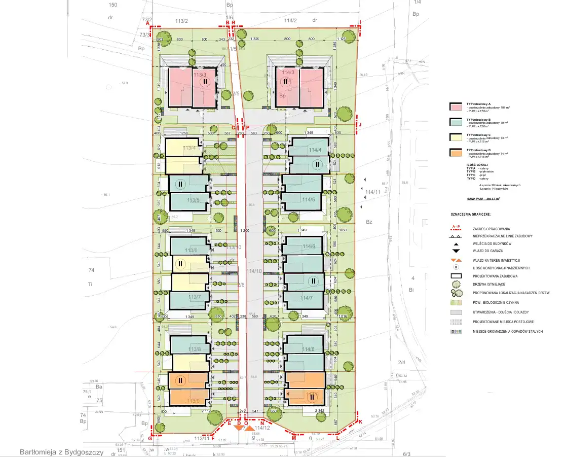Zakończenie inwestycji: I etap grudzień 2026 r. (14 budynków po prawej stronie), II etap grudzień 30.08.2027 (14 budynków po lewej stronie)