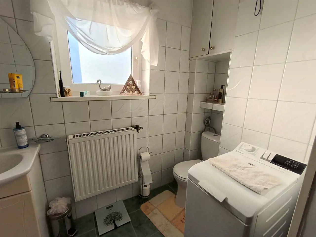 Piwnica wyłożona płytkami, stanowiąca doskonałą przestrzeń do przechowywania, warsztatu, pralni lub domowej siłowni.