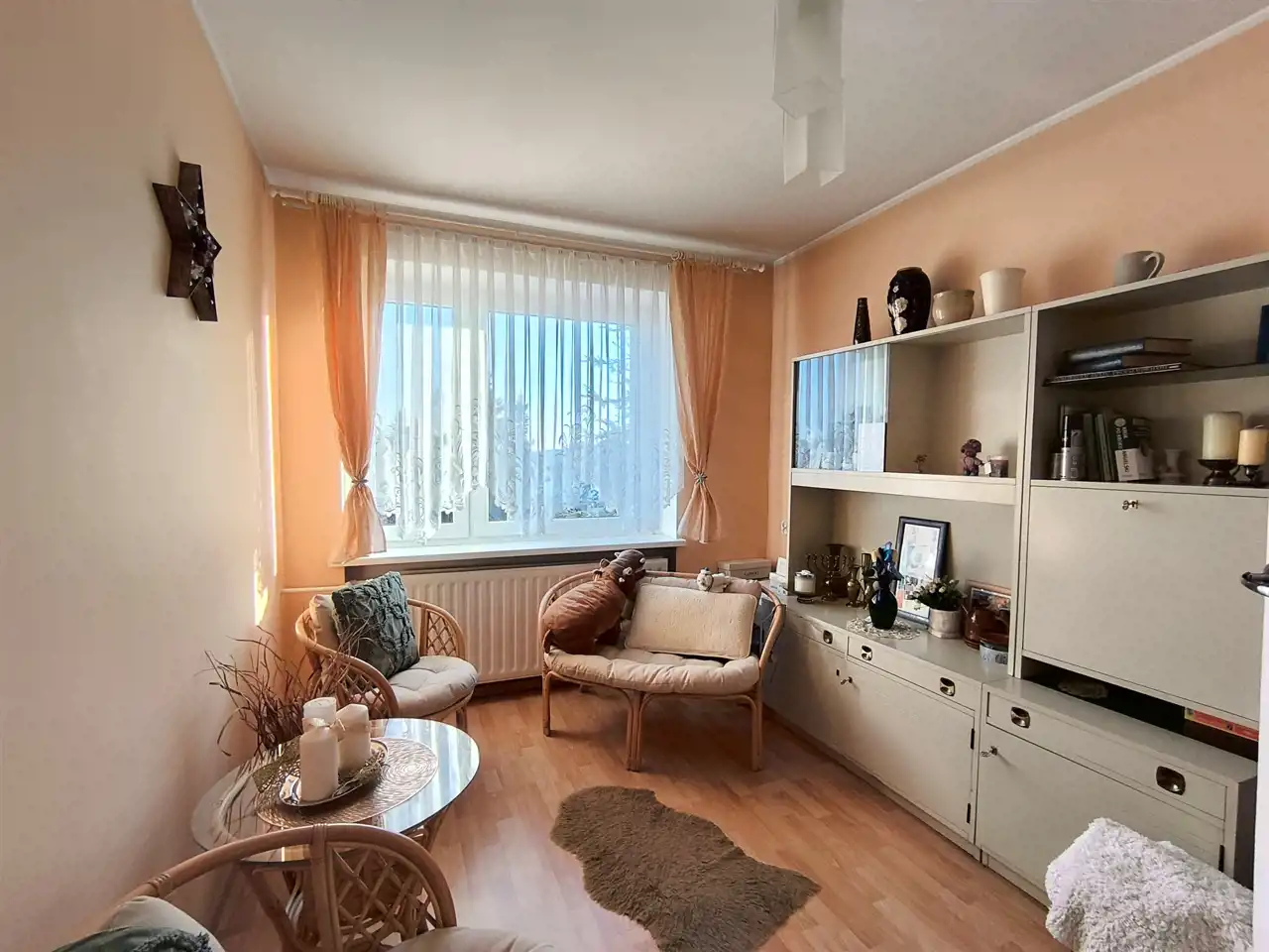 Przestronny salon o pow. ok. 28 m² z klimatyzacją oraz wyjściem na balkon z widokiem na zagospodarowany ogród.