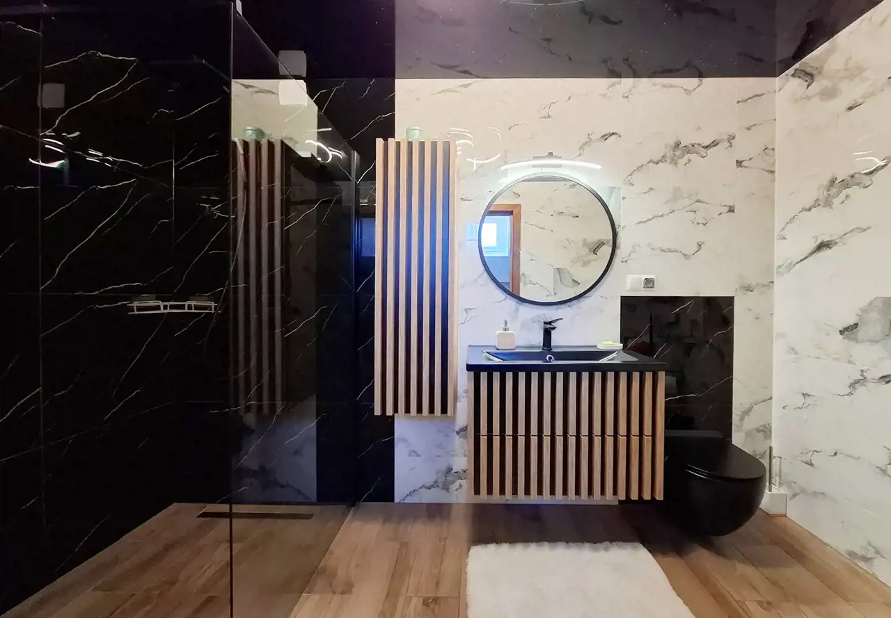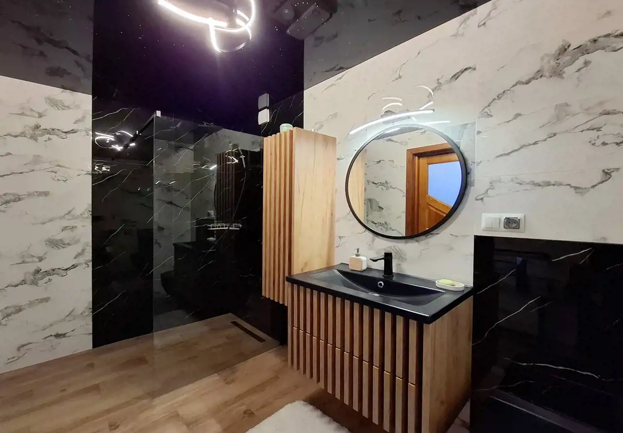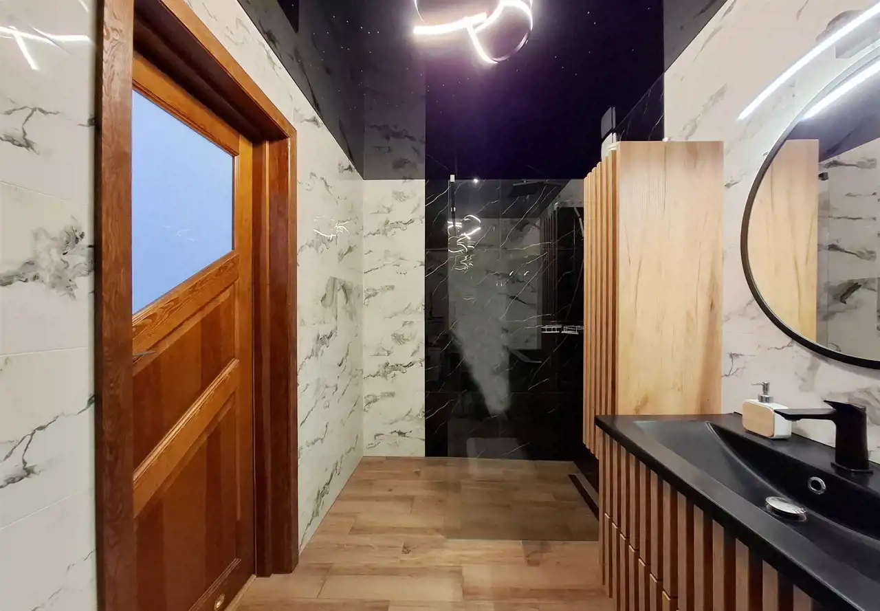 - łazienka z WC wyposażona w napinany sufit z efektownym oświetleniem LED imitującym gwiazdy nocą, co tworzy bardzo przyjemny klimat wnętrza
