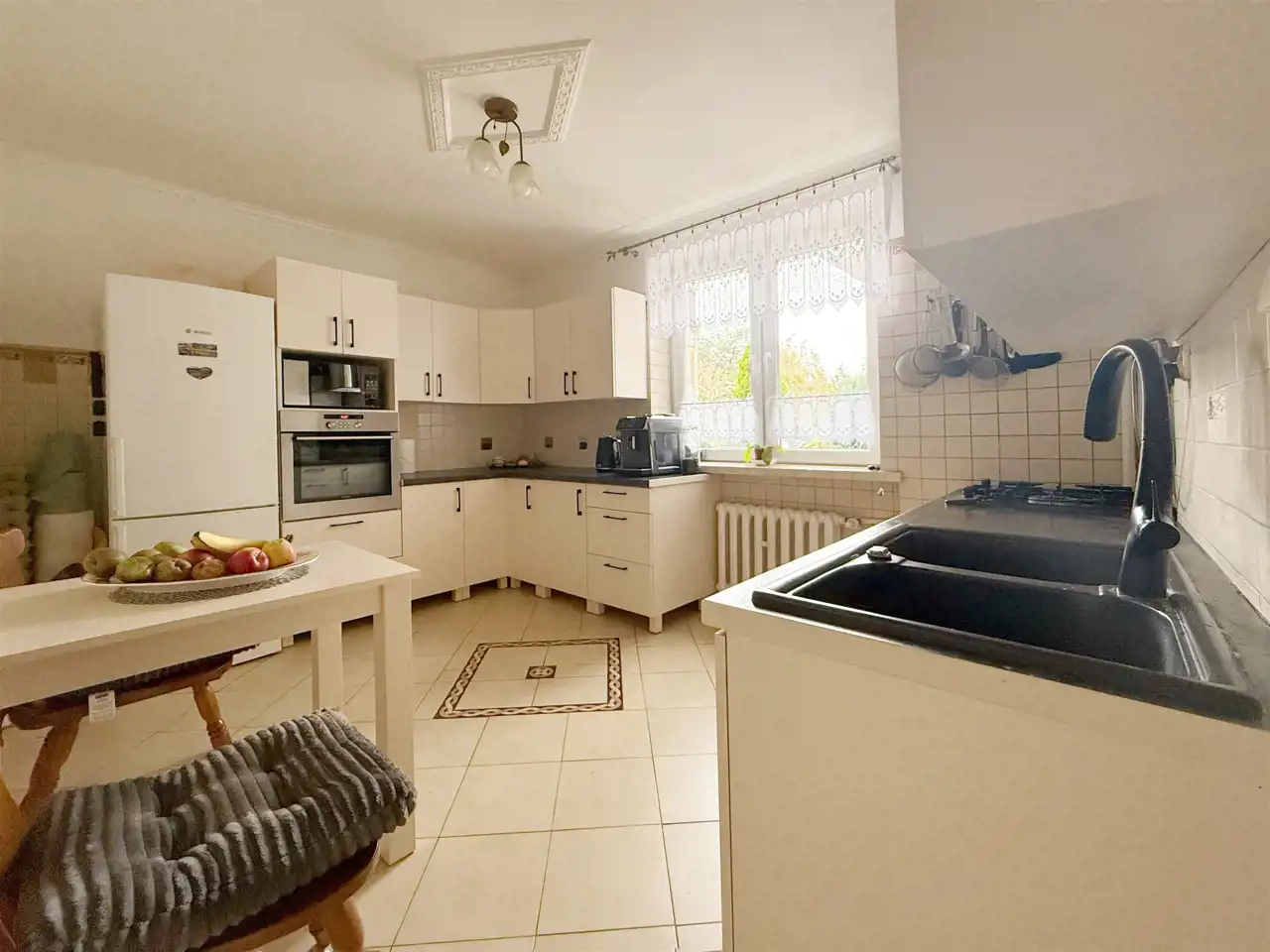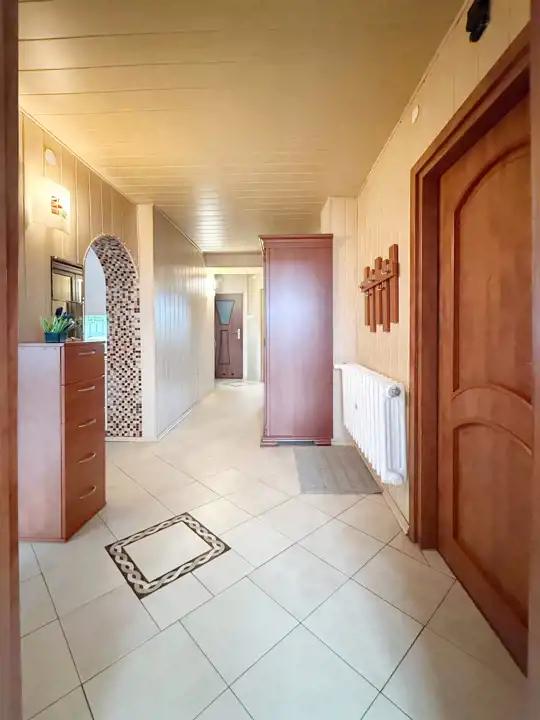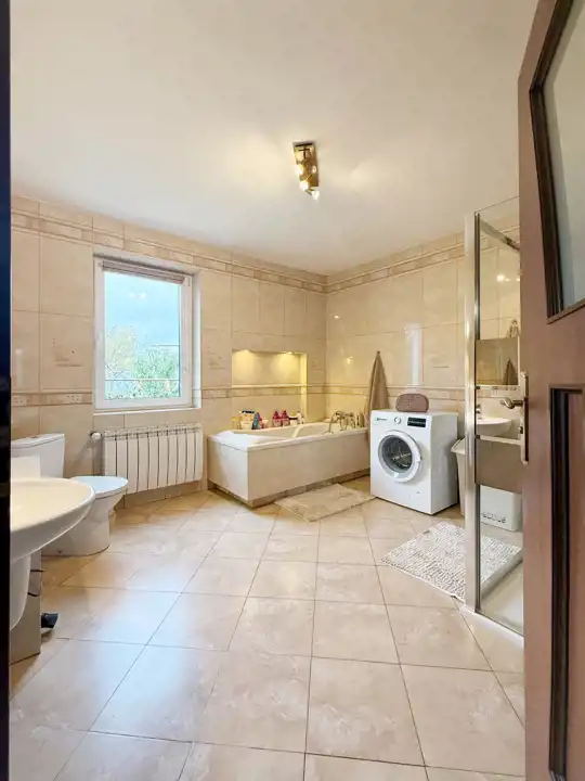 - Wykończenie: nowoczesne płytki ścienne i podłogowe, panele drewniane, kuchnia na parterze z meblami na wymiar (zakup 2024).