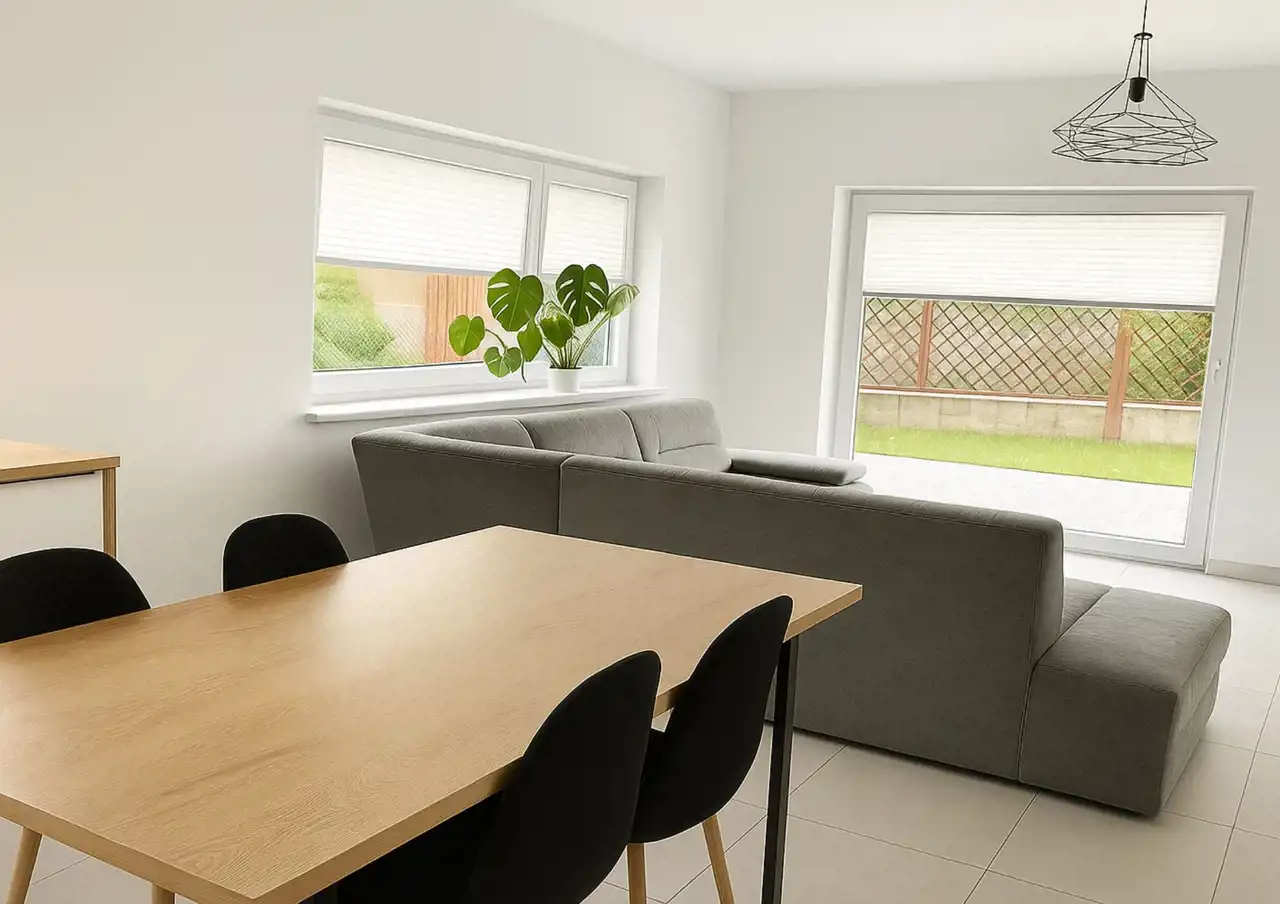 przestronny salon z wyjściem na taras i automatyczną markizą,