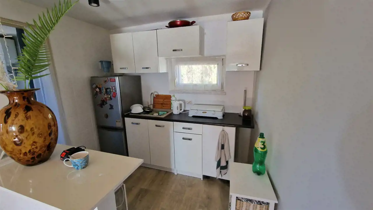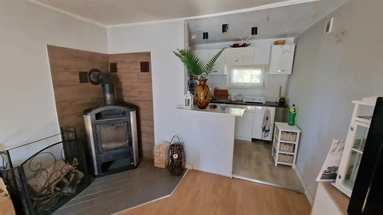 Domek ocieplony, ogrzewany kominkiem, woda z własnego ujęcia dostępna cały rok, prąd całorocznie.