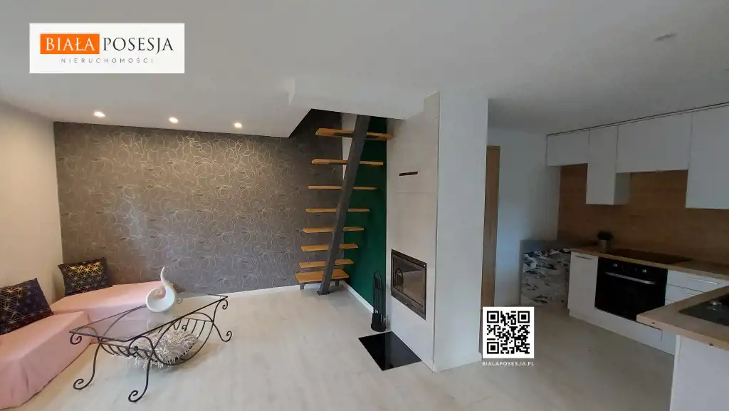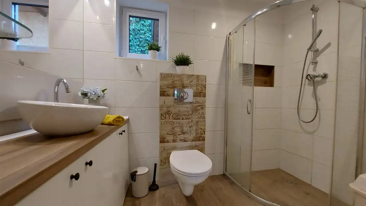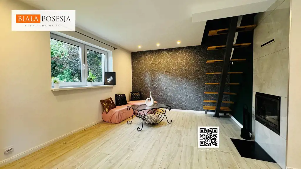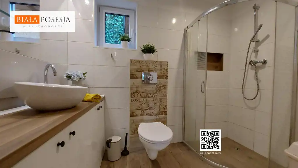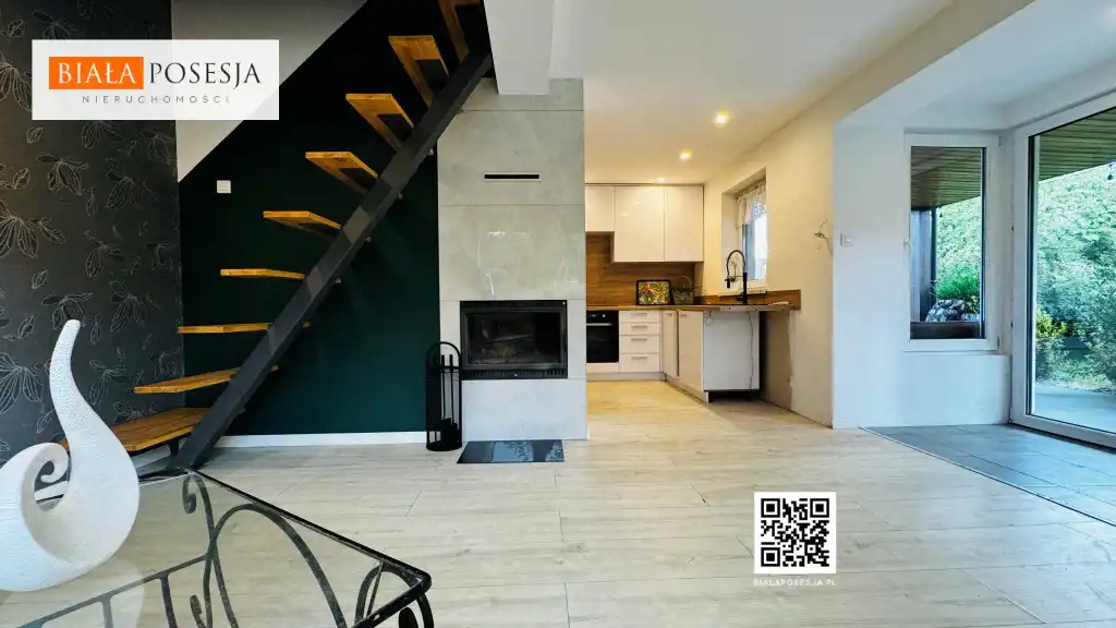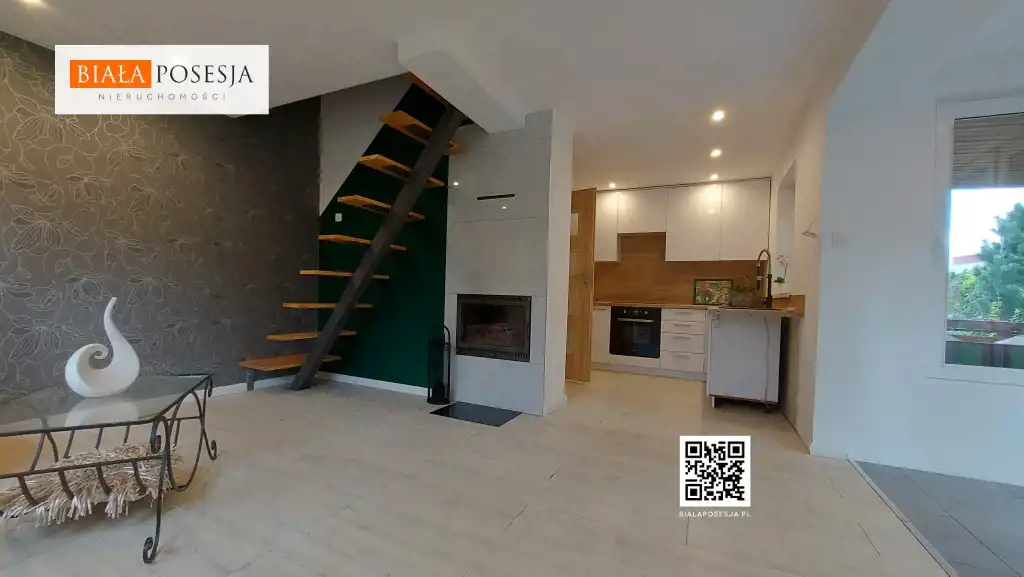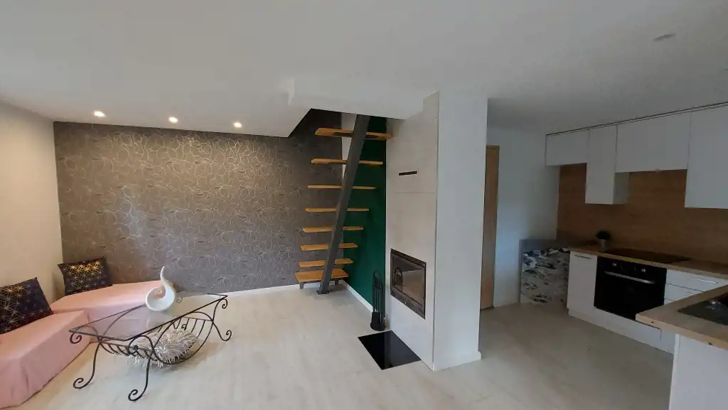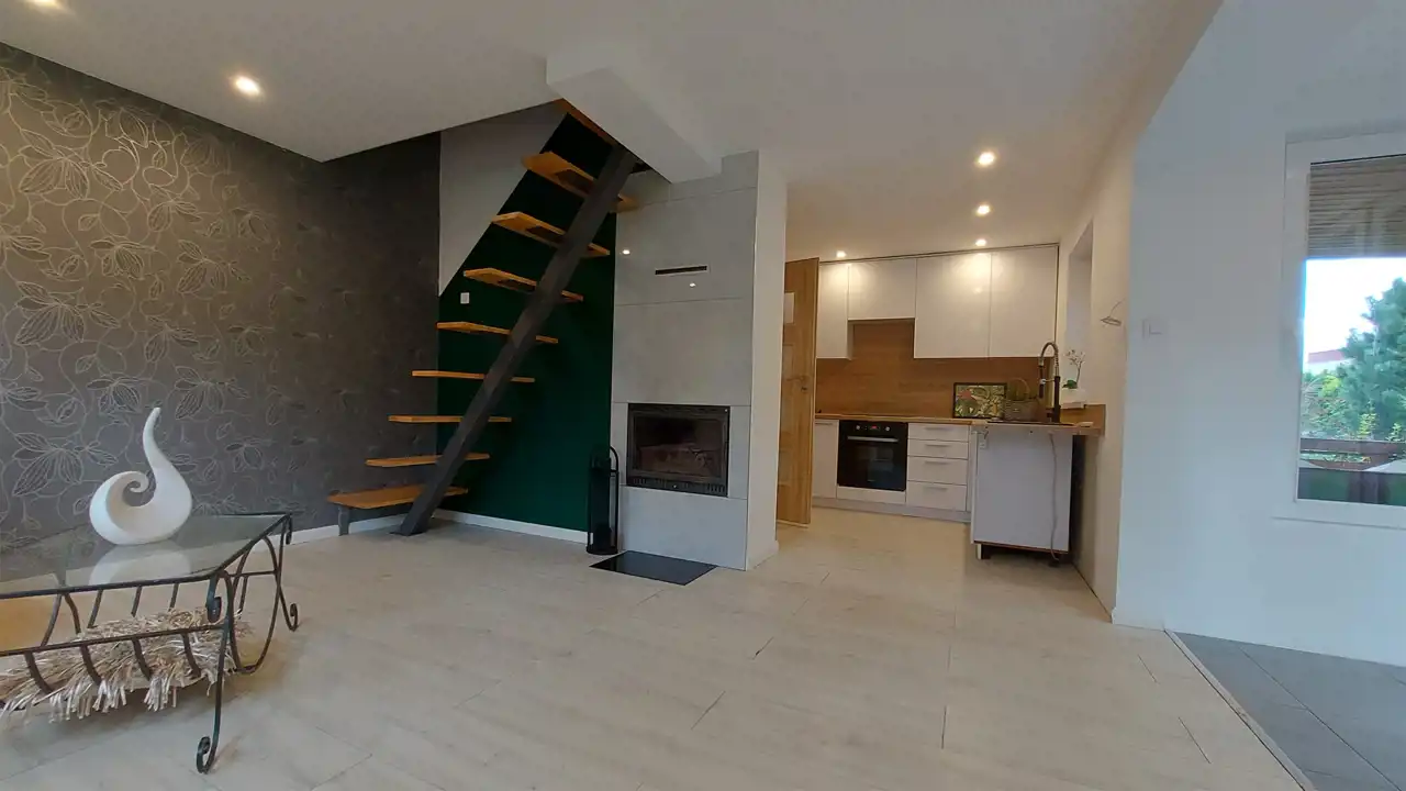 - Parter: salon z kominkiem, otwarta kuchnia, łazienka z prysznicem, WC i umywalką,