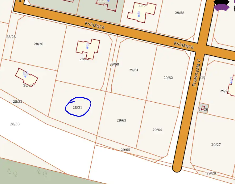 Dojazd zapewnia prywatna droga od ul. Książęcej – działka drogowa jest wyłączną własnością sprzedającego i nie podlega służebnościom.