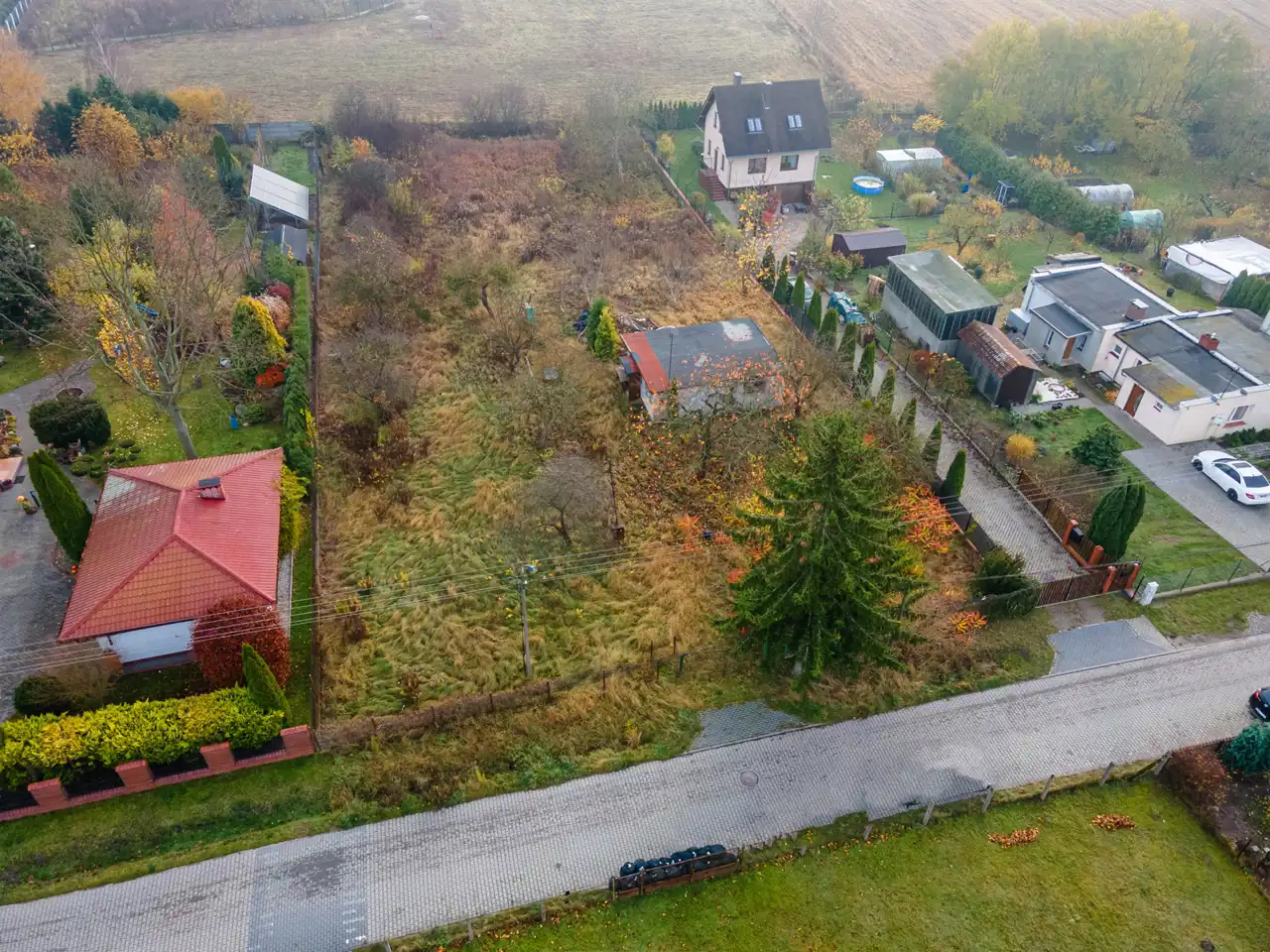Działka ogrodzona z dojazdem drogą z kostki brukowej.