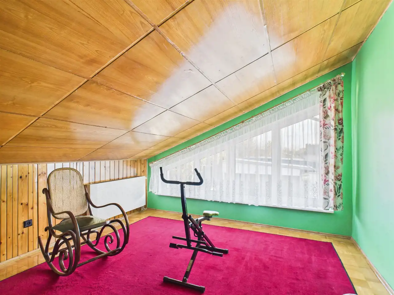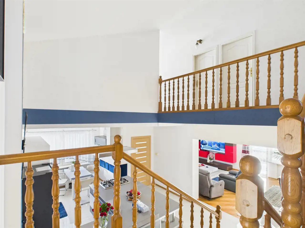 Na półpiętrze znajduje się wyjątkowo ustawna i przestronna sypialnia, która może pełnić rolę: