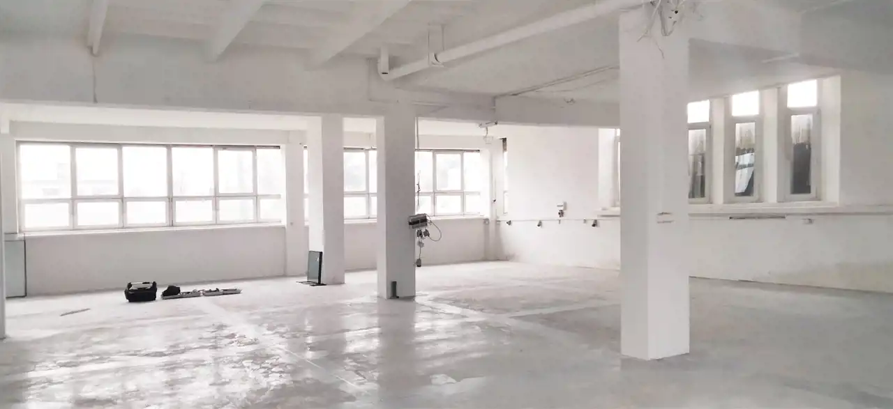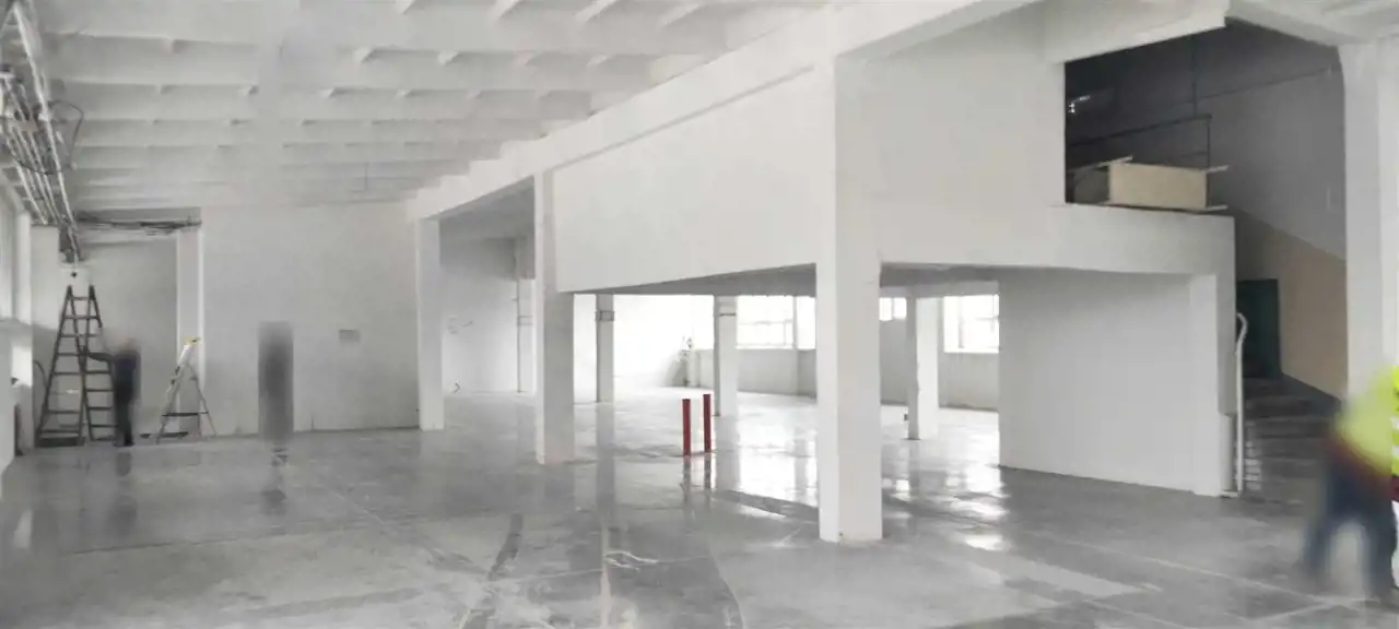 Budynek po remoncie, nowa posadzka przemysłowa niepylna.