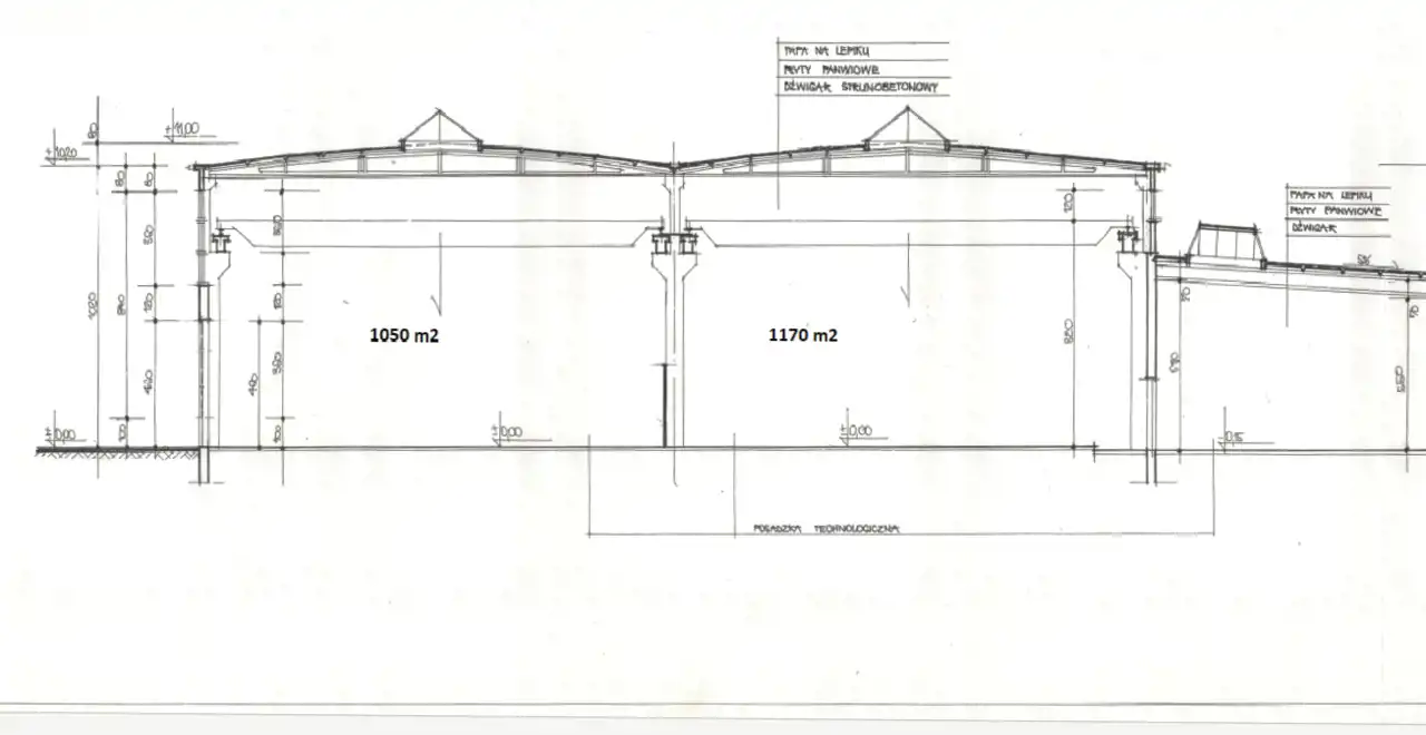 Hala produkcyjna o powierzchni 1170 m2 z suwnicami 10T; 3T, z częścią biurowo-socjalną 30 m2.